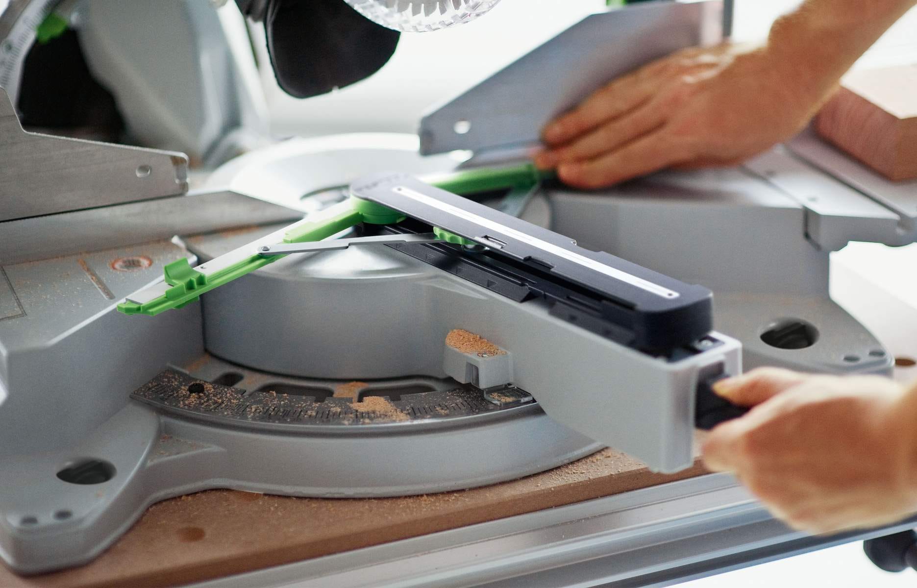 A double laser line precisely marks the saw cut. A high-quality cast magnesium base increases rigidity while keeping weight to a minimum. The special cutting position of the KS 120 allows you to cut strip material up to 4-5/8" (120 mm) vertically against the stop or cut coving and cornices. Variable speed preselection, smooth start-up, overload protection and also with integrated quick-acting brake. Always optimally prepared with FastFix for simple and quick replacement of the saw blade. Fine adjustment for setting the saw blade angle accurate to the millimeter. As with all important control elements, it can be adjusted quickly and conveniently from the front of the machine. With ergonomic hand grips for left-handed and right-handed users, cord holder, transport safety device, clamp and an extremely compact, lightweight design. With ergonomic hand grips for left-handed and right-handed users, cord holder, transport safety device, clamp and an extremely compact, lightweight design. Extraction system and chip deflector funnel extract the chips from where they are produced.