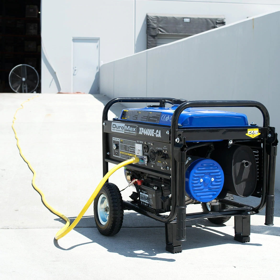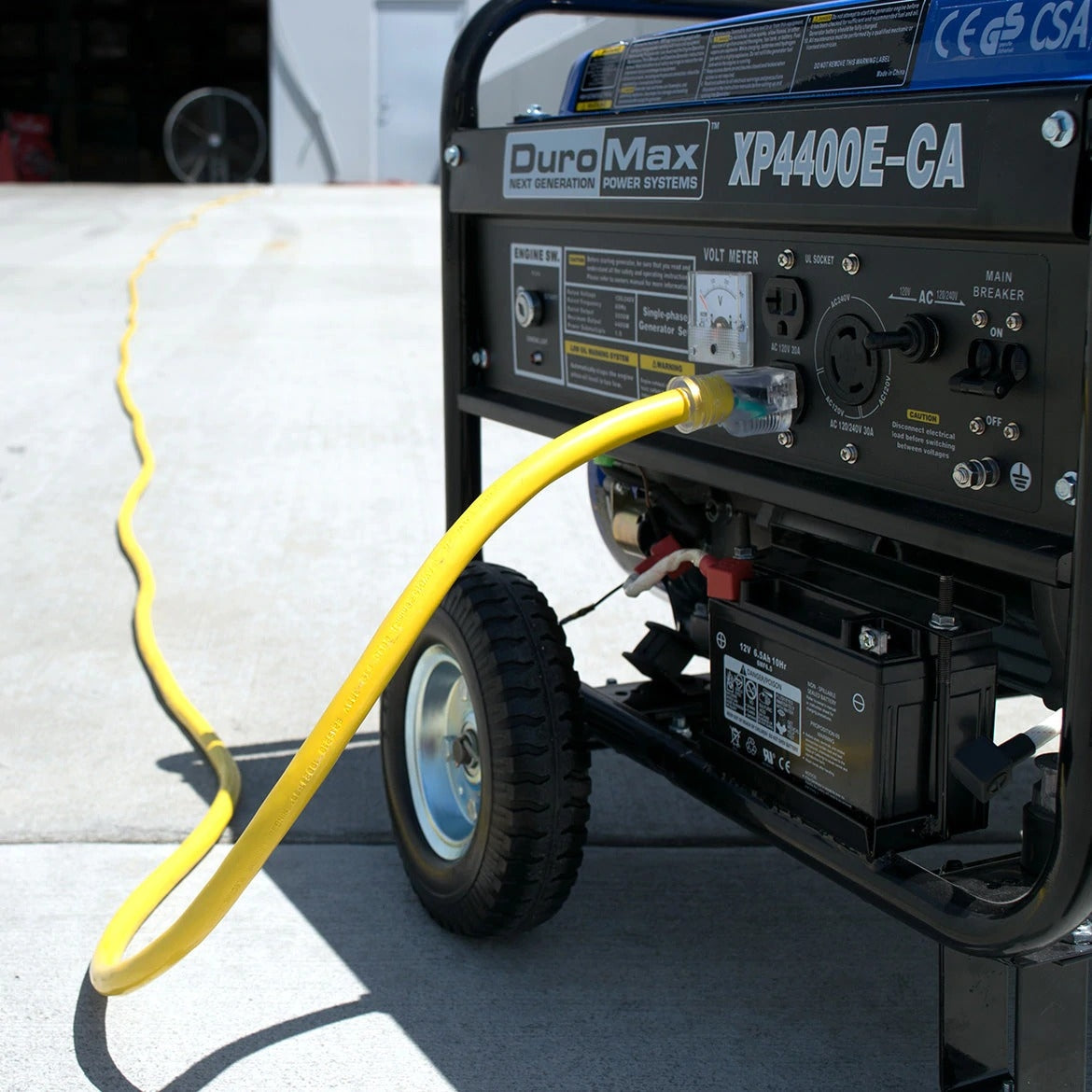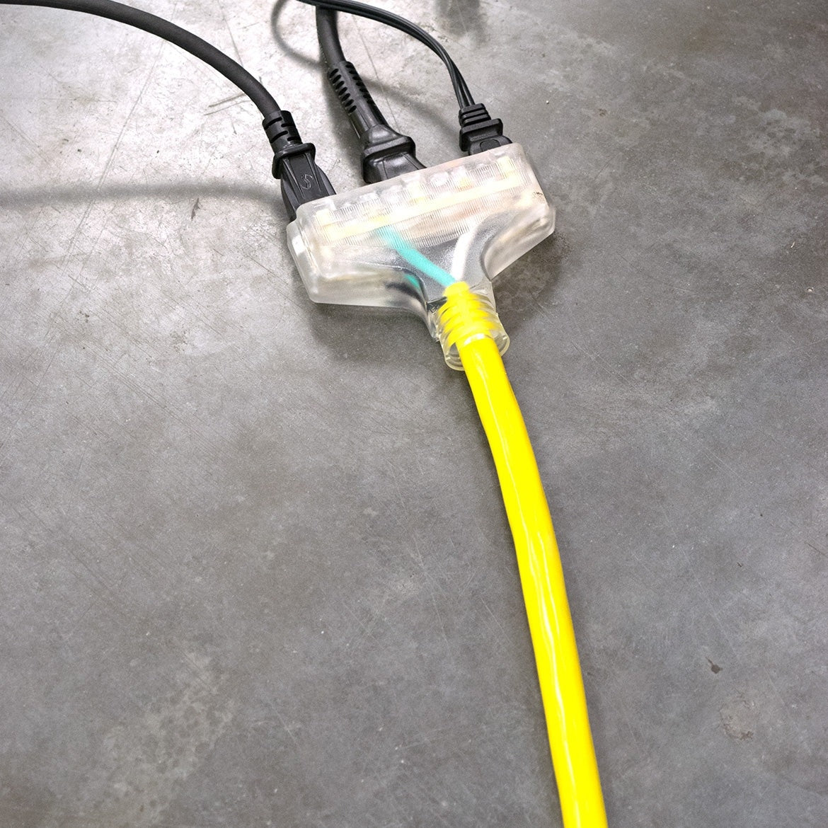The DuroMax XPC10025C is our robust 25 ft 10-gauge heavy duty triple tap extension cord with lighted ends. This extension cord features a 100% copper wire for better power quality, an SJTW jacket rating for outdoor use, bright yellow color for high-visibility, reinforced blades minimize bending of prongs, and UL certification for peace of mind.