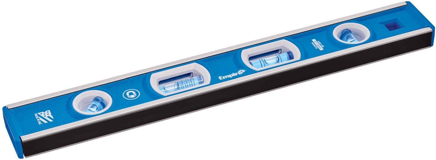 The Empire em81.12 Magnetic Tool Box Level features e-Band vials that highlight the meniscus of the bubble to provide a clear reading at plumb, level, & 45°. A Vari-Pitch vial reads pitch in 1/8", 1/4", 3/8", and 1/2" per foot of horizontal run of the working material. High visibility vial surrounds provide clear viewing of vials. A magnetic edge frees the users hands when working with metal surfaces and a reinforced aluminum frame with top read windows allow vials to be viewed from above. The em81.12 is proudly Made in the USA at Empire Level in Mukwonago, WI & backed by a Limited Lifetime Warranty.