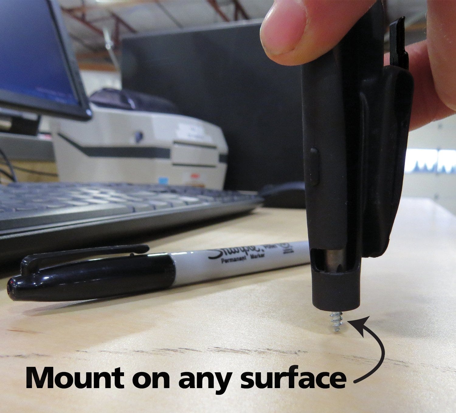 The Sharpie Holster is a nifty little tool designed to make using a Sharpie on the job easier and more efficient. Fitted with a belt/pocket clip and two bench and table mounting options, your Sharpie can now easily be capped and uncapped with one hand, saving you time. The cap simply clips into the holster and then to your pocket or table, keeping your sharpie right where you need it.