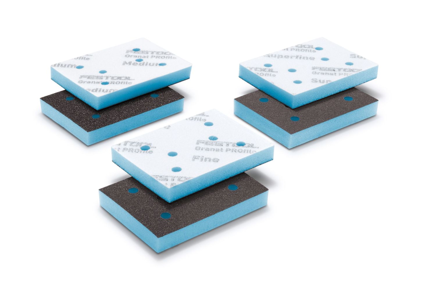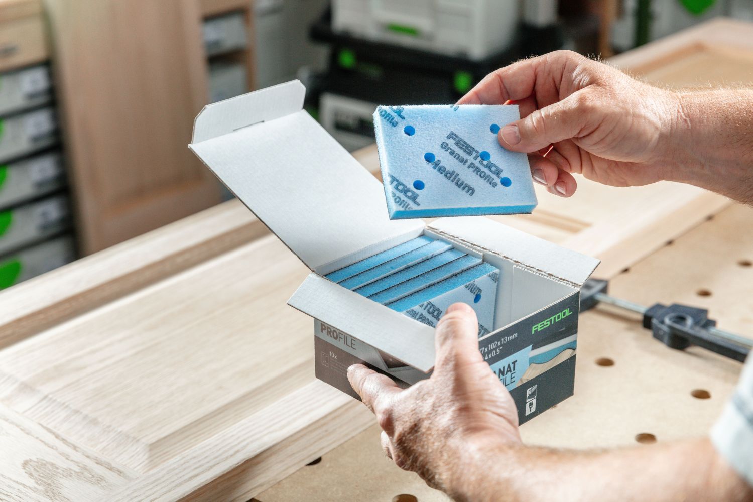 developed for precision surface preparation on complex shapes. Backed by a 1/2" (13 mm) layer of flexible polyurethane foam and bonded with Festool’s high-performance Granat abrasive, this system delivers aggressive sanding power while conforming effortlessly to contours, curves, and profiles. Whether you're working on intricate moldings, raised panels, rounded edges, or turned spindles, Granat PROFILE adapts to the surface for consistent, high-quality results. Optimized for use with sanding power tools, this abrasive excels where traditional flat abrasives can’t. It’s built to handle modern coatings—ideal for VOC-compliant clear coats—and works equally well on wood, painted surfaces, plastics, acrylics, solid surface materials, fillers, and repair compounds. Granat PROFILE brings Festool’s precision and durability to detailed work—making it the go-to solution for finishers, woodworkers, and painters who demand control, flexibility, and exceptional surface quality.