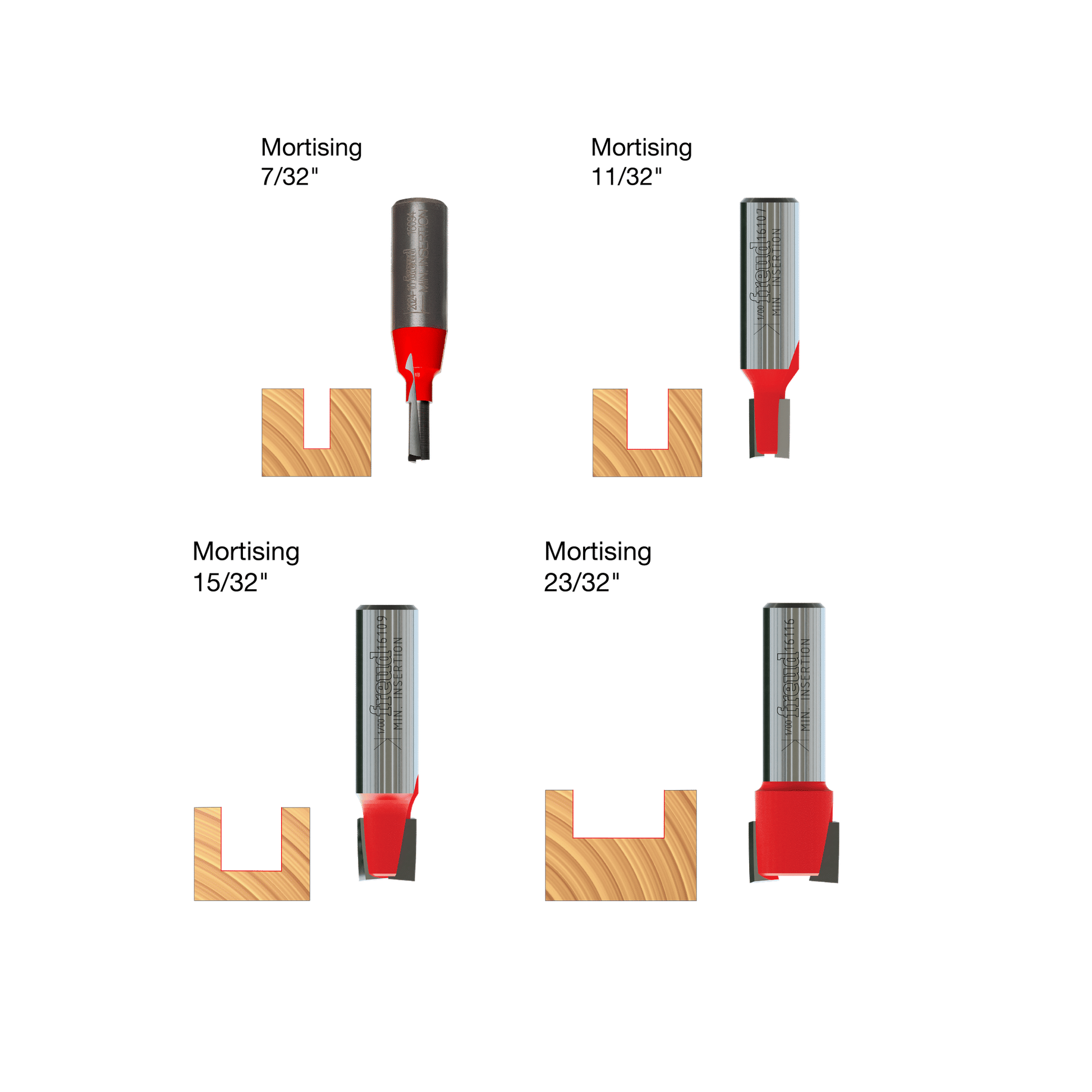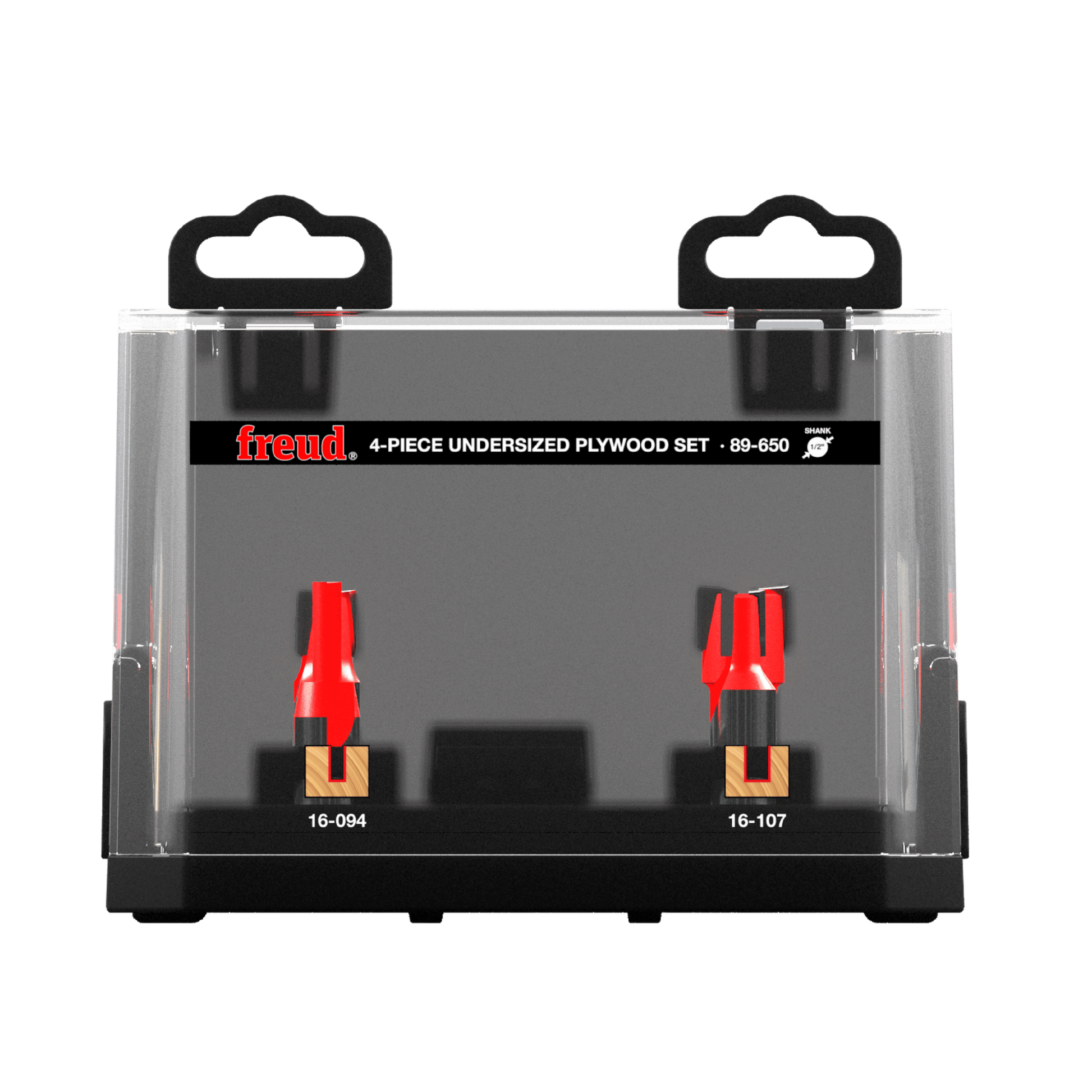 Freud Undersize Plywood bits are designed to rout perfectly fitted grooves and dadoes for today's undersized plywood panels. These two sets include bits that match up to the actual thickness of 1/4", 3/8", 1/2" and 3/4" plywood. Choose 1/4" or 1/2" shank sets. Both include a wooden case, and are suitable for use with hand-held or table-mounted routers to cut hardwood, softwood, plywood or composites.