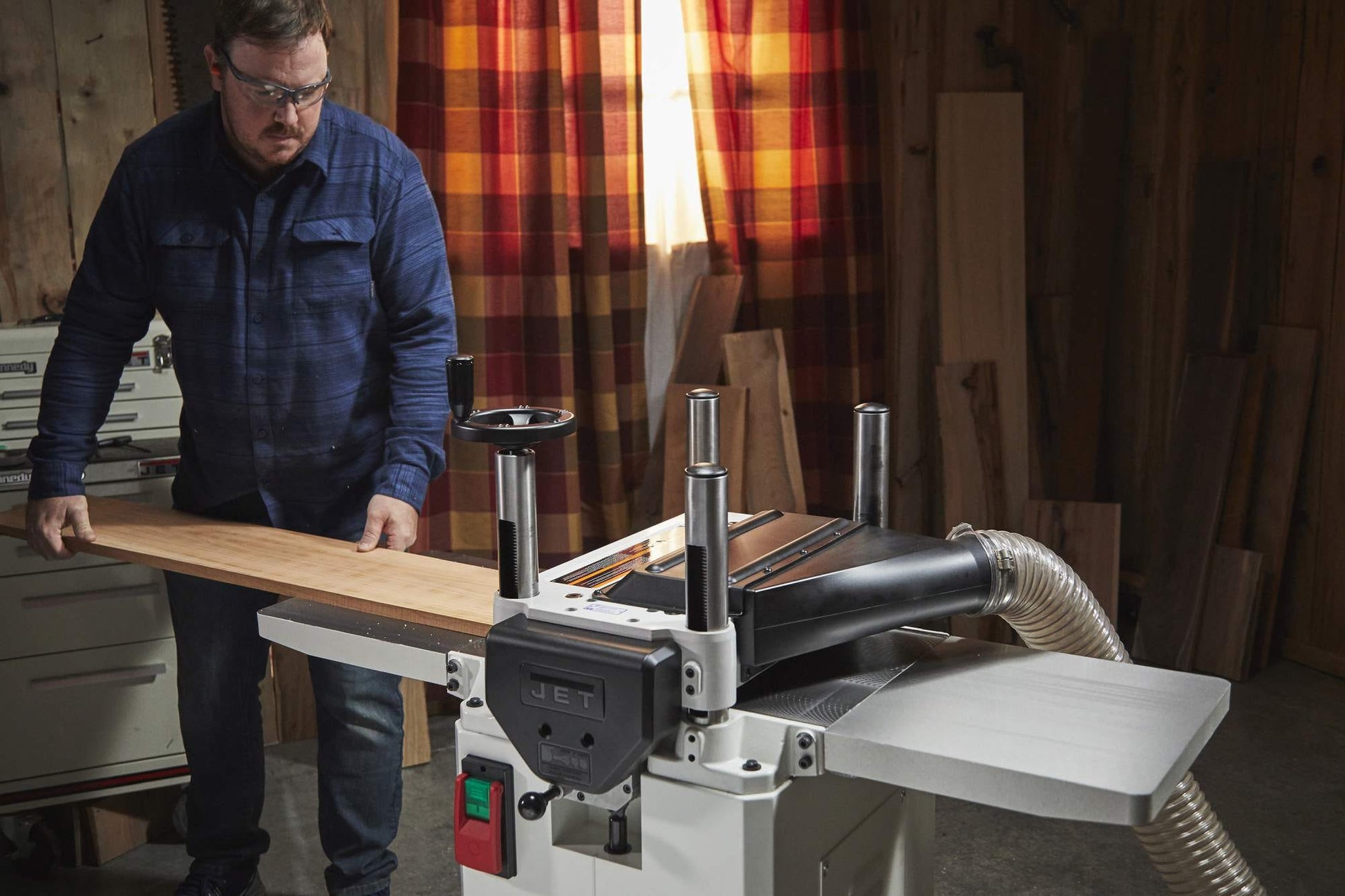 The New JET 15” helical head planer quickly and quietly transforms rough lumber into smooth boards. This machine means business with a powerful 3 HP motor combined with a helical cutterhead housing 48 staggered carbide quick change knives. The innovative Precision Air Strut System (PASS™) provides consistent upward pressure on the cutterhead, reducing the chance of board snipe. The conveniently located two-speed gear box allows for quick and easy feed rate adjustments while removing up to 1/8-inch material with each pass for a smooth finish. A large Precision cast-iron table and infeed/outfeed tables make this planer a beautiful addition to the shop. Add knowledgeable customer service professionals standing by if you need them, and you’re good to go.