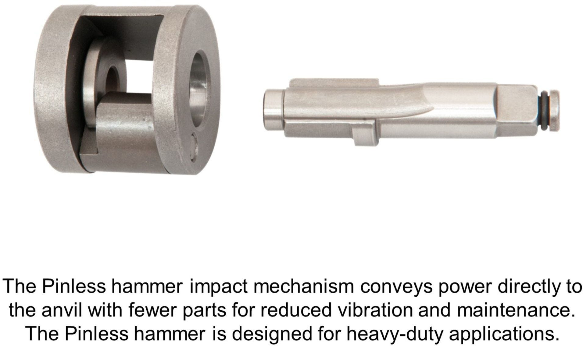 - Pinless hammer impact mechanism conveys power directly to the anvil with fewer parts for reduced vibration and maintenance