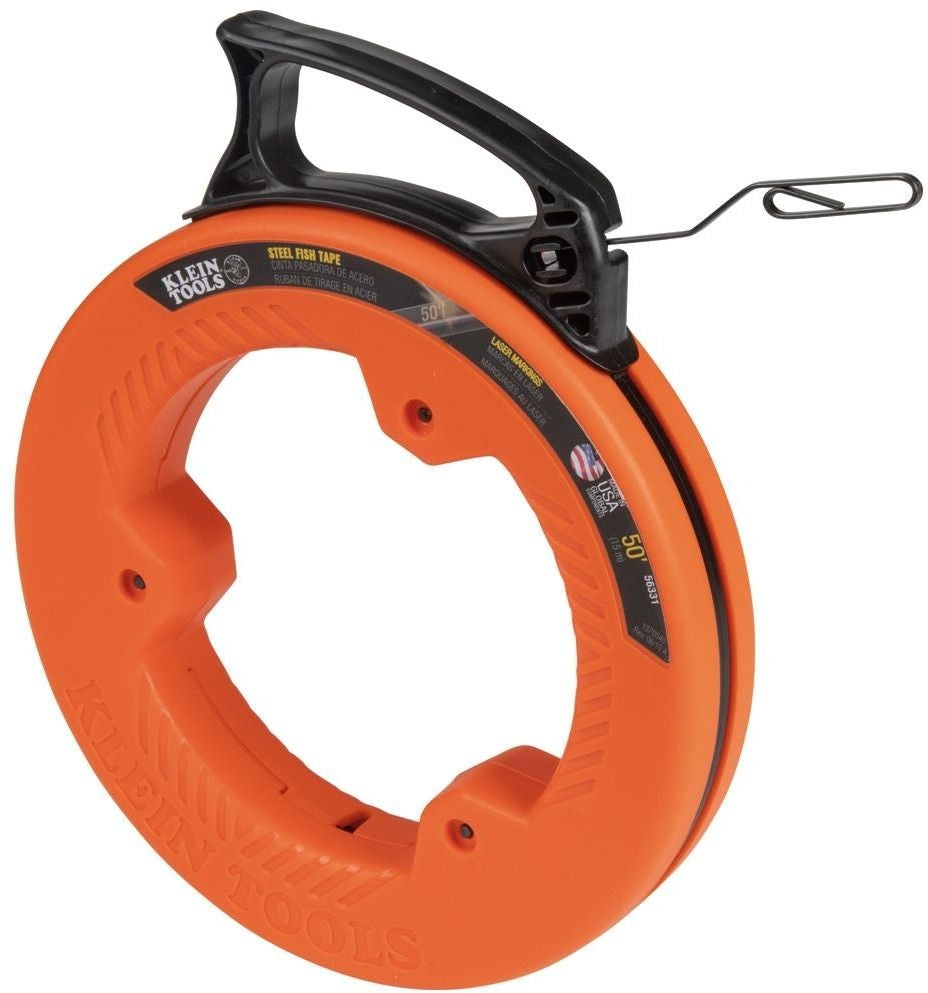 The Klein Tools' 50-Foot Steel Fish Tape is perfect for wire runs associated with light commercial, residential and voice-data-video installations. The optimized housing and handle design decreases payout effort and reduces binding. The large handle allows for a firm, steady grip as you pull the tape from the housing. The tape features laser-etched descending markings placed at every foot. These markings allow you to accurately measure the depth of conduit runs and determine the amount of tape left to pay out.
