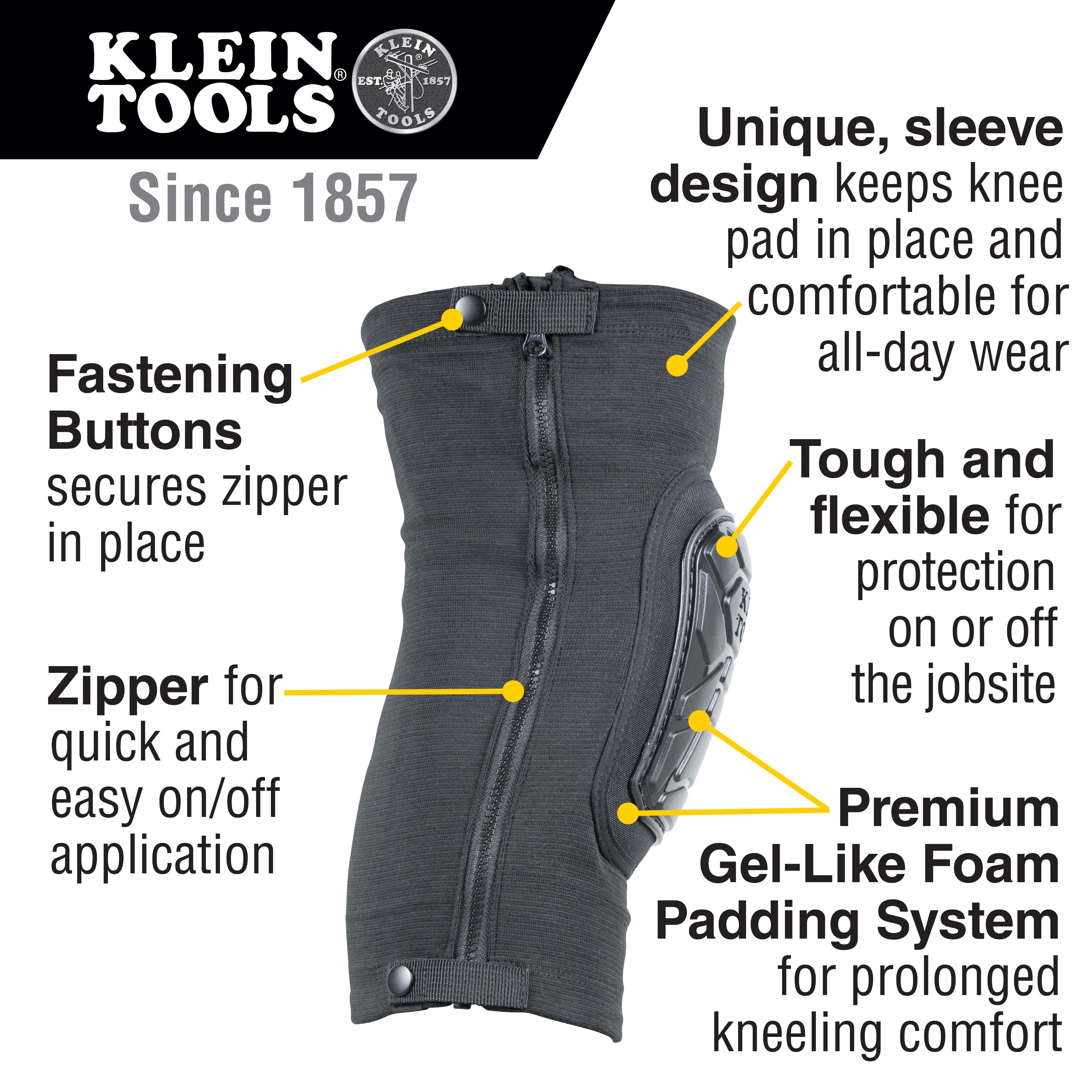 The Tough-Flex Knee Pad Sleeves from Klein Tools feature a slim, low-profile and unique, sleeve design that keep the knee pads close to your body and centered in place throughout the day. These sleeves feature a zipper to be put on and off easily while wearing work boots. The front of the sleeve is designed with a tough, flexible cap for agility and protection on the jobsite. Neoprene and EVA foam padding provides the ultimate comfort for all day kneeling comfort for any jobsite or weekend task that puts pressure on your knees.