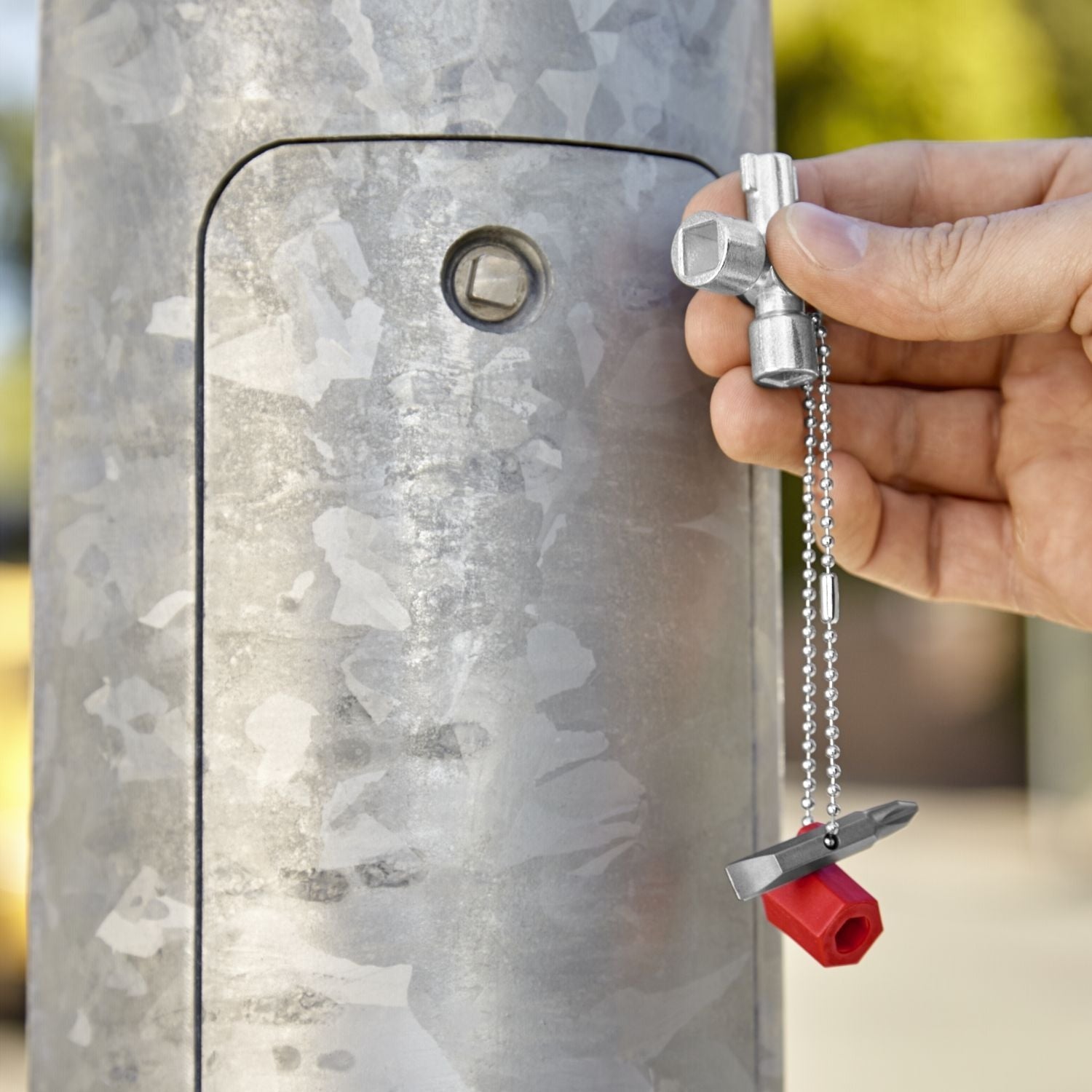 - 4 arm version - includes the following keys: (2) Square nut - 15/64" and 5/16", (1) Triangular nut - 23/64" and (1) Dual bit - 1/8" - 13/64"