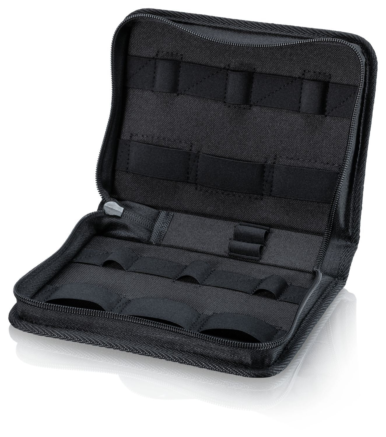 - Zippered case made of durable polyester fabric with sewn in elastic bands
