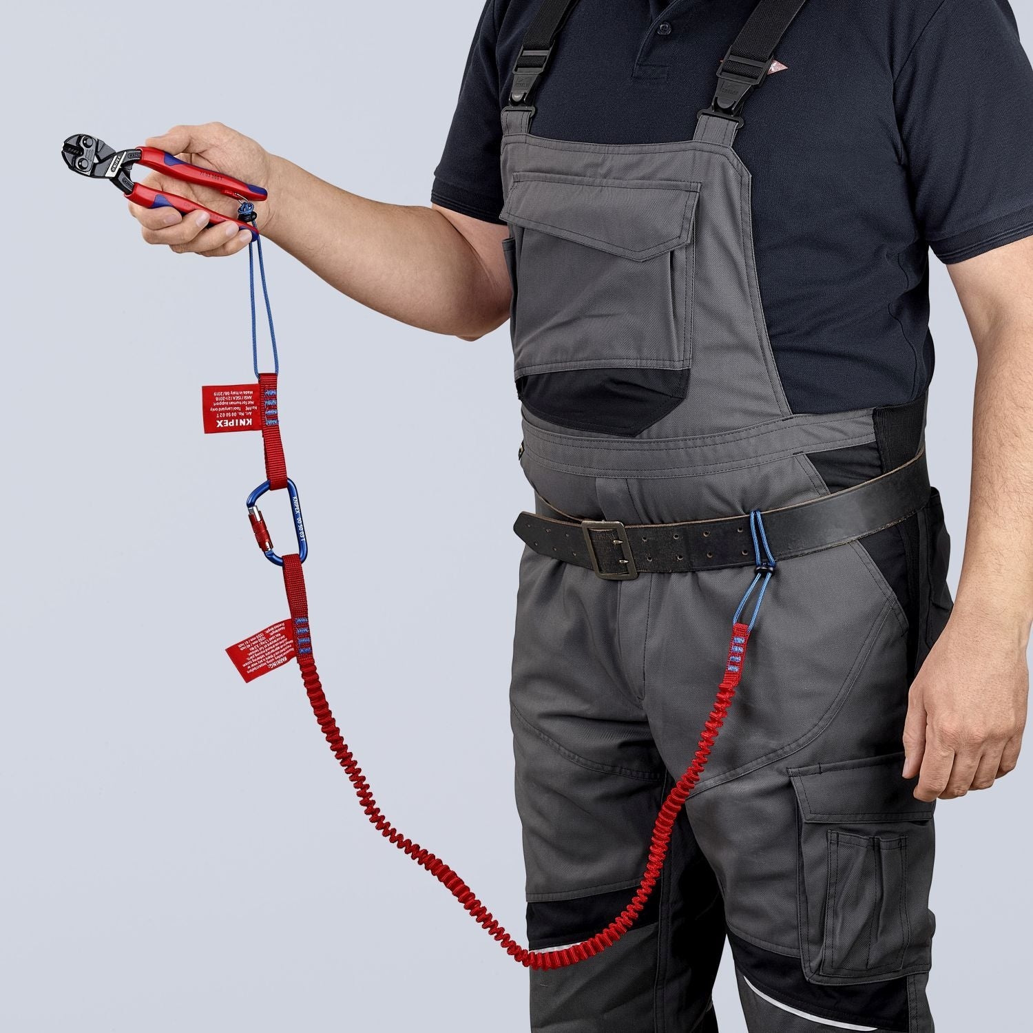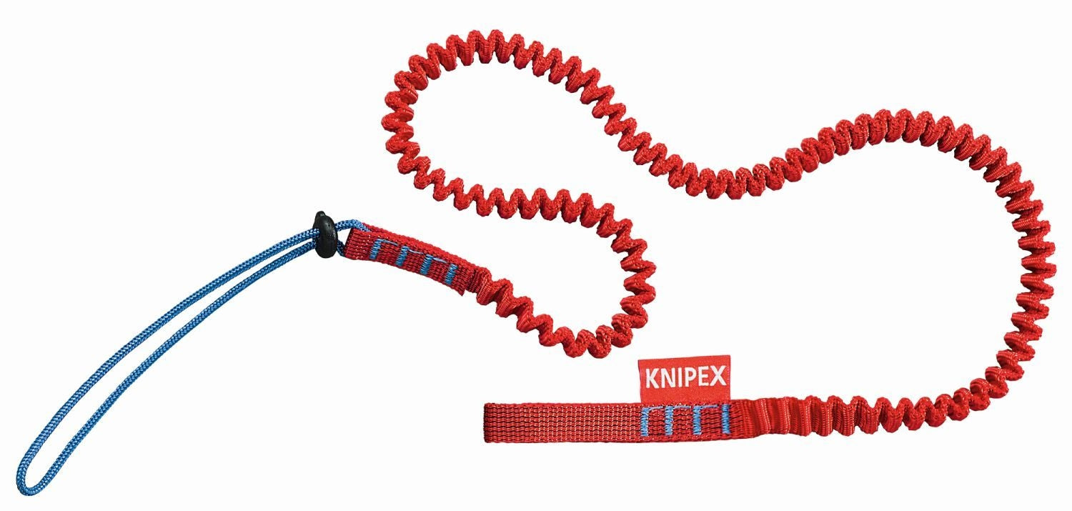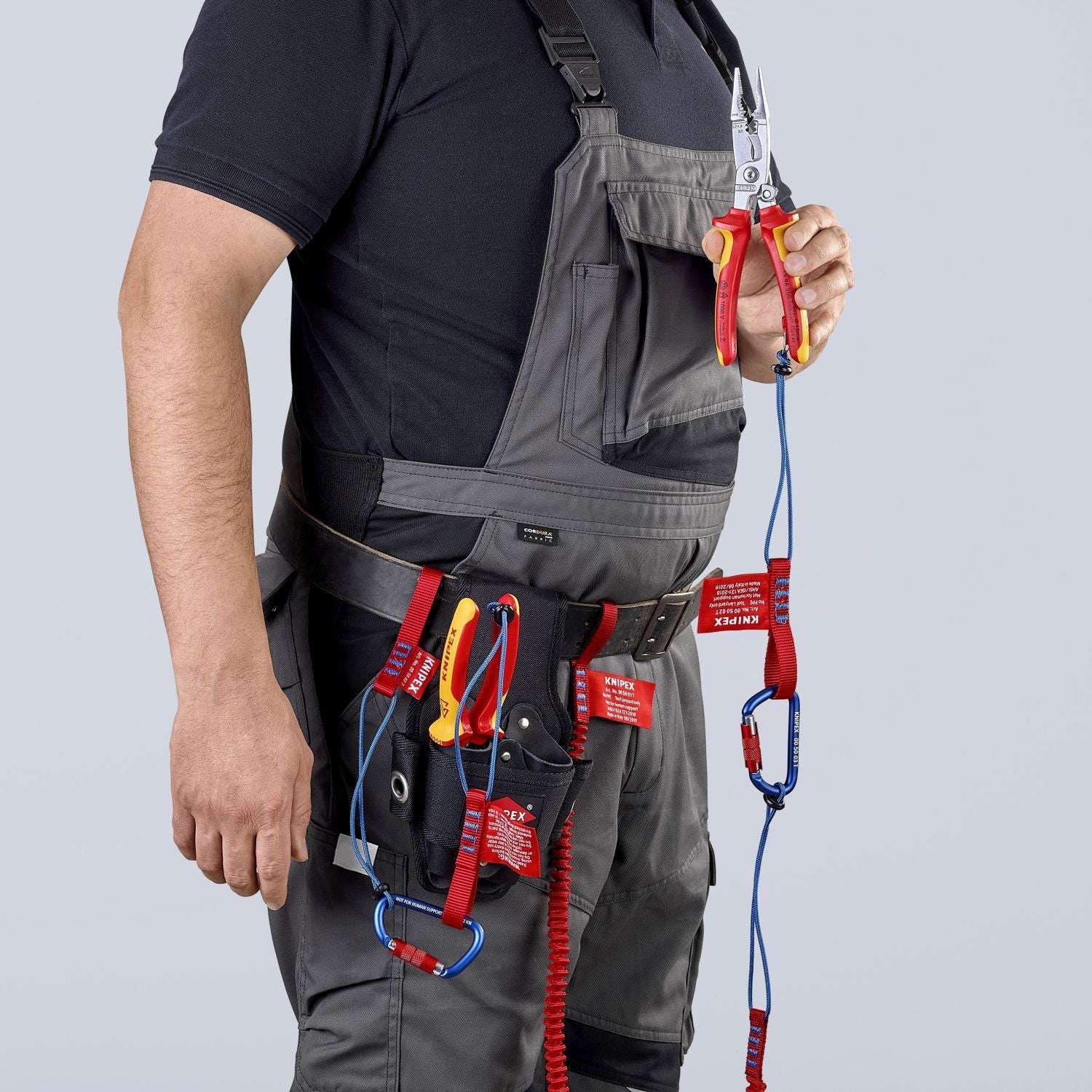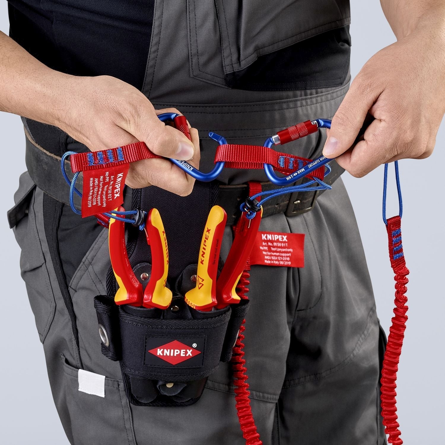 The KNIPEX tethered tool program effectively protects against accidents caused by falling tools when used correctly. Tools can be secured to prevent falling down during use with cherry pickers, scaffolding and ladders and also by industrial climbers with wire ropes and high altitude rescue workers. The lanyard is made of gathered fabric tape that expands to approximately 5' when under strain. The carabiner features a screw lock which prevents gate from opening unintentionally. The adapter strap can be attached directly by the cord to the wrist, belt and climbing equipment. Instructions come with each piece of the lanyard system.