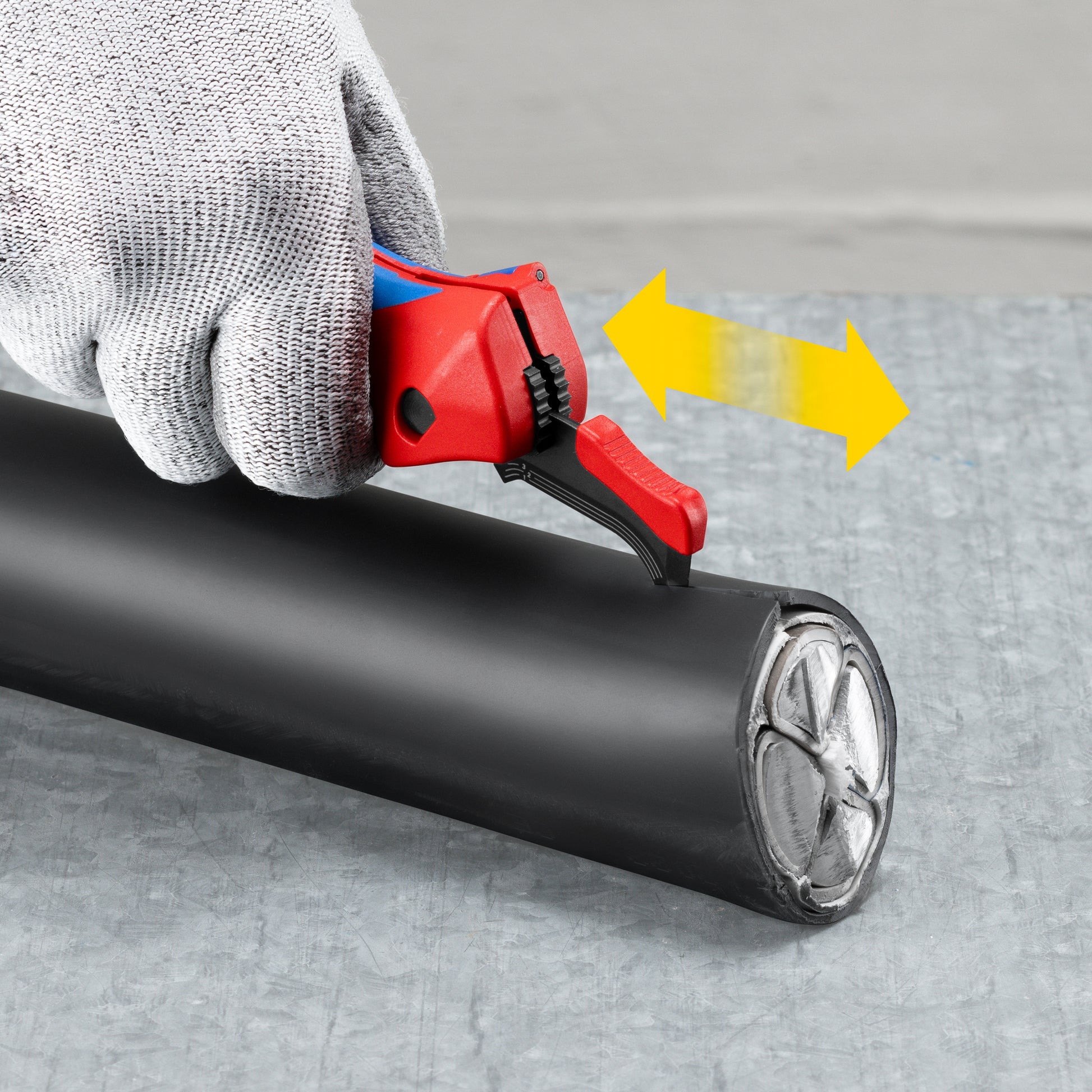 - Three-line depth gauge on blade indicates depth in cable insulation in millimeters