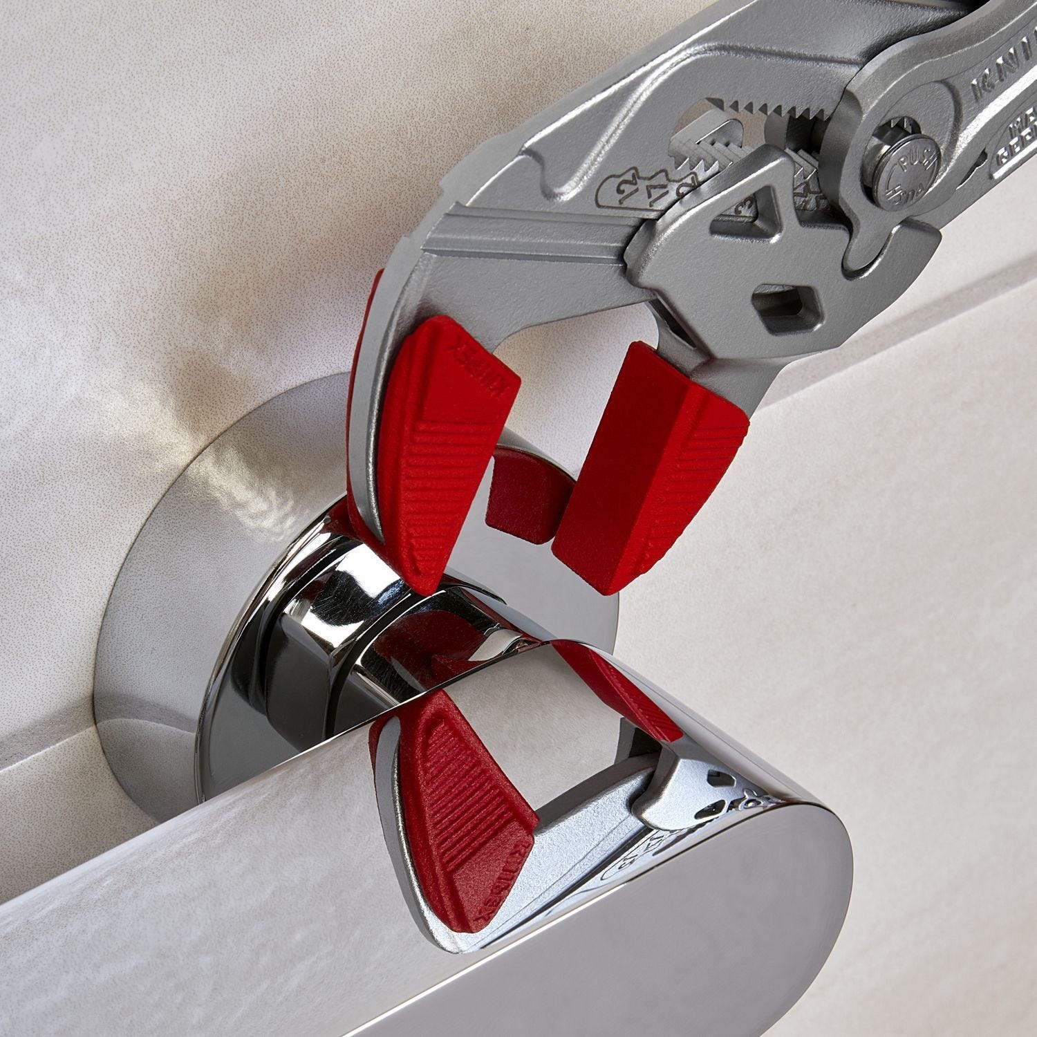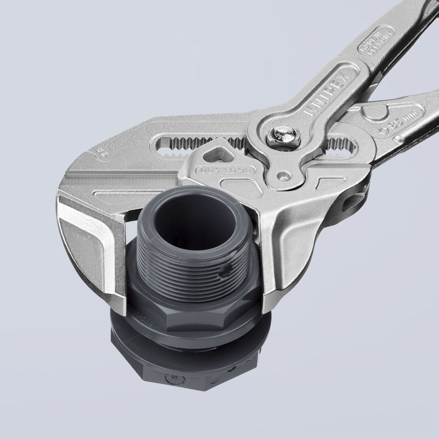 A pliers and a wrench in a single tool. The unique installation tool now in 16" length for opening widths up to 3 3/8". Open end wrenches with fixed opening widths are expensive, especially when used for large union joints. The KNIPEX Pliers Wrench XL with its' adjustable jaw opening offers enormous savings potential.
