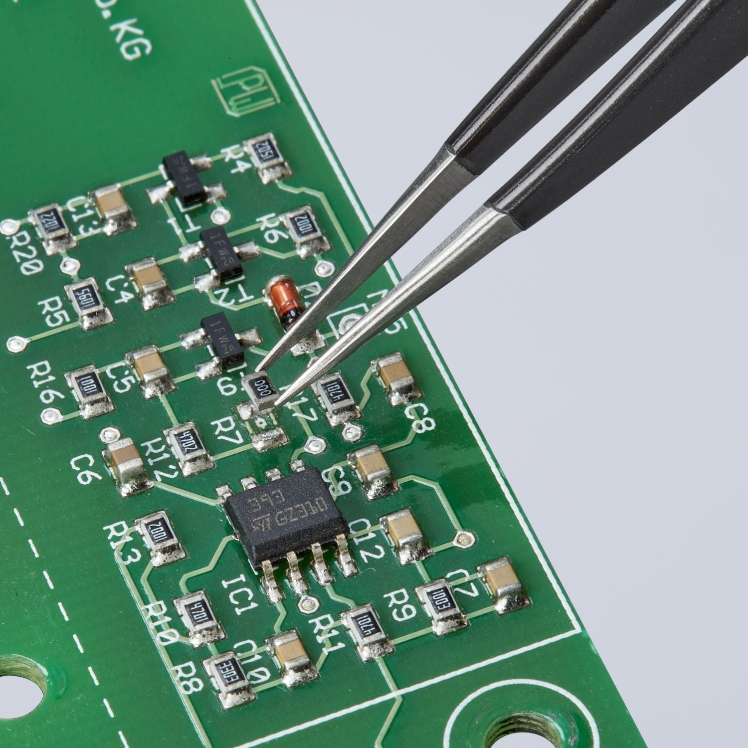 - Needle-point tips offer extra-fine gripping on very small components and wire
