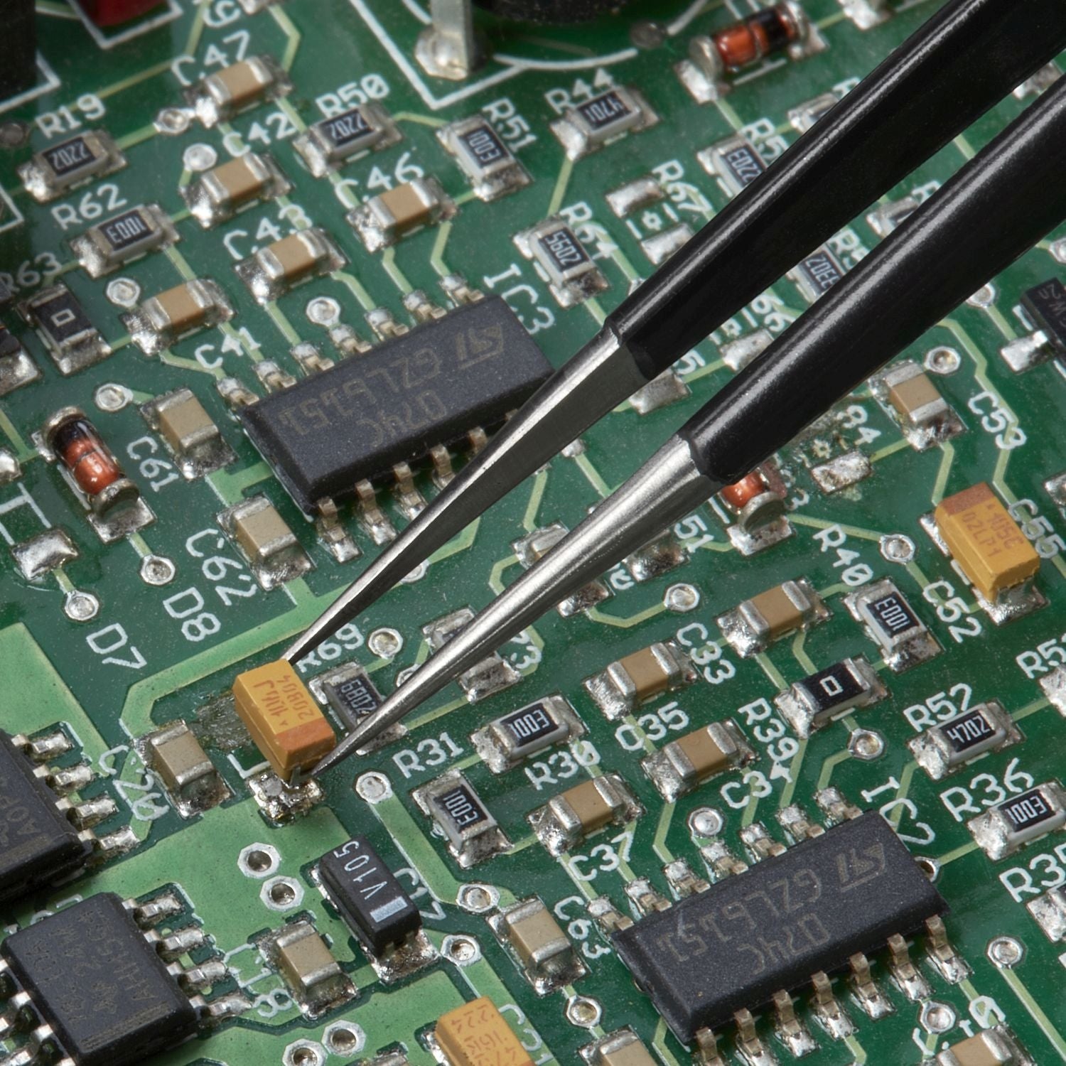 - Needle-point tips offer extra-fine gripping on very small components and wire