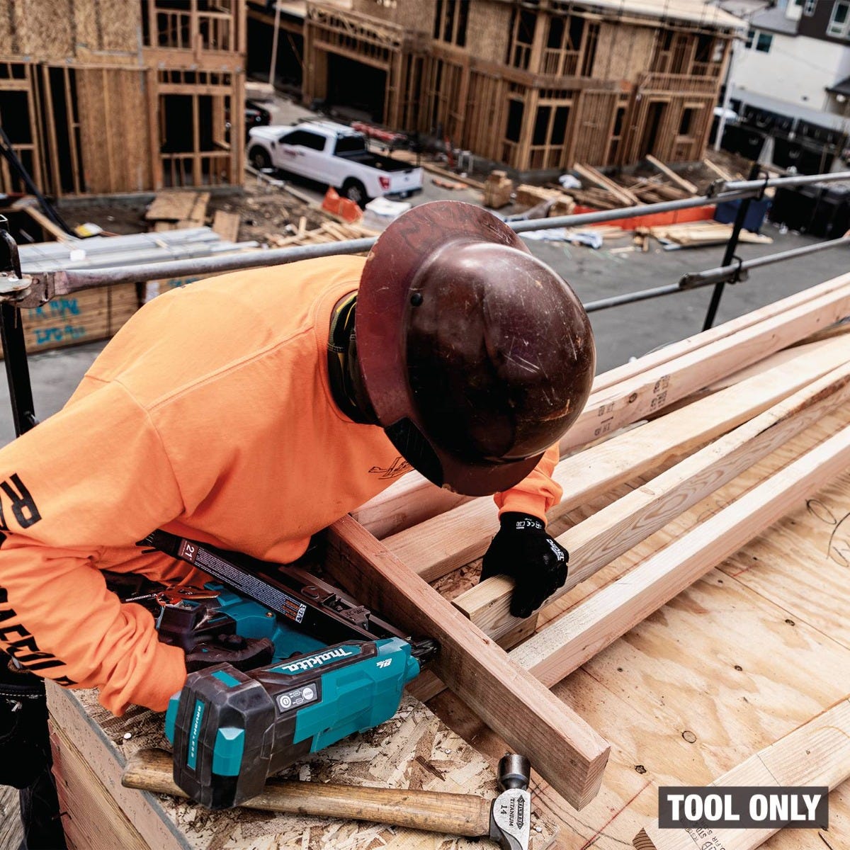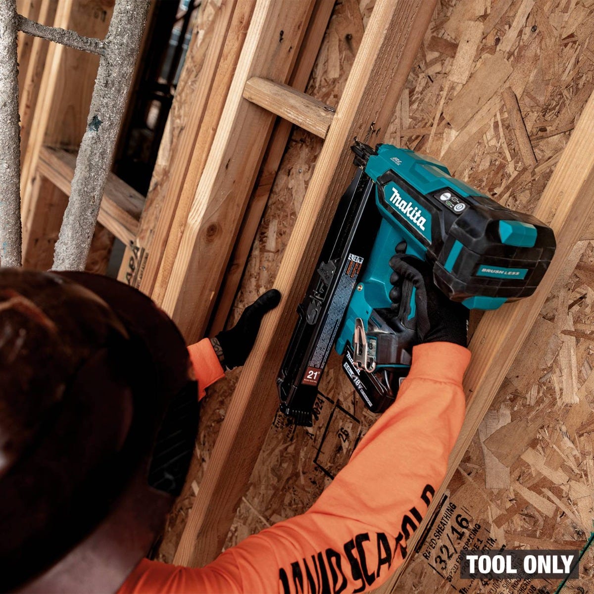 The Makita 18V LXT 21° Full Round Head 3 1/2" Framing Nailer (XNB03) drives full-round head nails into dense engineered lumber with the power of a pneumatic nailer. The XNB03 can drive up to 1,000 framing nails on a single charge of a 18V LXT 6.0Ah battery (battery sold separately). The 21° Full Round Head 3 1/2" Framing Nailer features a two-mode selector switch that allows the operator to select sequential nailing or bump fire options. It features an anti-slip nose for controlled nailing at almost any angle. The Framing Nailer features a “tool-less" depth adjustment engineered for more precise flush and countersink nailing. The XNB03 is equipped with an anti-dry fire mechanism engineered to help prevent driving blanks and the Nailer features a rear lock-and-load magazine with 41 nail capacity for maximum efficiency. An accessory for the Nailer is the Extended Capacity Magazine Set (1914P1-6, sold separately) that holds 97 nails for more user productivity. The Framing Nailer drives 21º plastic collated framing nails from 2" to 3-1/2" in length and .113 to .148 in diameter. It weighs only 11.9 lbs. with 18V LXT battery (battery not included) for reduced operator fatigue. Convenience features include a built-in L.E.D. light that illuminates the work area, a belt hook with a retractable extra-wide tool hook that secures the tool when not in use, and an ergonomically designed handle with a rubberized soft grip that provides increased user comfort. It’s part of Makita’s expanding 18V LXT System, the world’s largest cordless tool system powered by 18V lithium-ion slide-style batteries. Makita 18V LXT Lithium-Ion Batteries have the fastest charge times in their categories, so they spend more time working and less time sitting on the charger. For improved tool performance and extended battery life, Makita created Star Protection Computer Controls. Star Protection is communication technology that allows the Star Protection-equipped tool and battery to exchange data in real time and monitor conditions during use to protect against overloading, over-discharging and overheating. For increased versatility, the tool can also be powered by Makita 18V LXT Lithium-Ion Batteries with the star symbol on the battery indicating Star Protection inside.