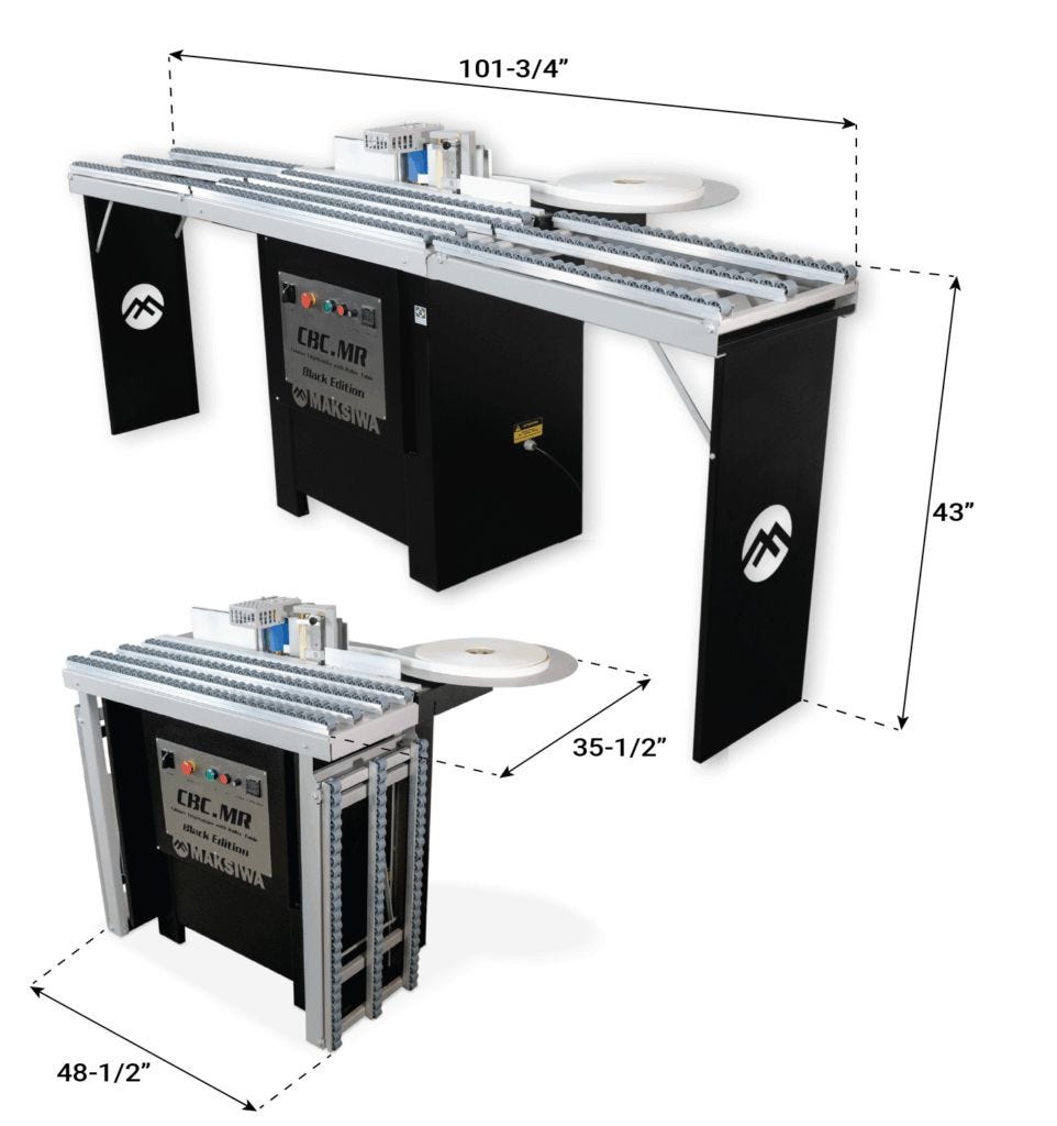 Cabinet Edgebander CBC.MR has a built-in retractable extension table providing a work area 3x times longer whenever opened, it is perfect for long pieces such as doors and panels and it has 6 speeds allowing the operator to work as fast as he wants. If you are looking for an affordable and efficient edgebander, the CBC.MR Black Edition is the ideal machine for you.The CBC MRI Bender was developed to bring practicality and increase efficiency to the demanding woodworker.This machine is ideal to glue edge tape on medium and large pieces. It will glue edge banding tape on materials like PVC, paper, and wood that is not pre-glued. It has a glue pot capacity of one and a half pounds, and we work with low temperature granulated hot melt glue.The machine has a 110-volt single phase motor. The edge tape max height is 3 inches and works with 0.45 millimeter to 2 millimeter tape thickness. The spring-loaded glue spindle adapts to any imperfections your piece may have. You can easily regulate the desired amount of glue to be applied.It has a built-in manual tape cutter. The in-fit fence guide will align the workpiece to the glue spindle. The rear pressure plate will assist with the bonding of the glue and the tape.The tape guide guarantees the alignment of the tape against the workpiece. The built-in table rollers improve the workpiece sliding process.The digital temperature control panel is simple to use, allowing you to set the desired temperature with precision.The fitted switch allows you to control the speed of the glue spindle. The extended tables will give you three times the normal work area. This machine is extremely simple and easy to use.