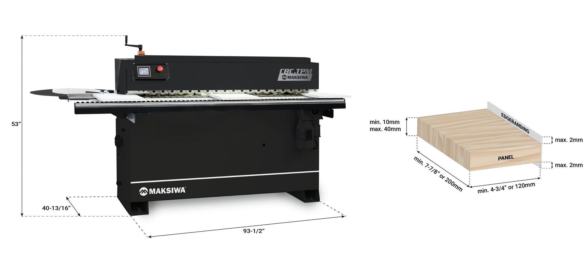 The Maksiwa CBC.TPM Automatic Edgebander combines precision and efficiency with a compact design, making it ideal for workshops with limited space. It features pre-milling, a gluing unit, a multi-function group for end trimming and top & bottom trimming, glue scraping, buffing, and vertical rounding for versatile performance. Equipped with a touchscreen panel, this machine ensures ease of operation and delivers a flawless finish. Each high-frequency motor is controlled by an independent electronic converter.A flawless bond starts with a flawless surface. The CBC TPM by Maksiwa has a pre-milling unit that removes imperfections and preps the panel for bonding—all in one smooth pass. It gives you a flat, clean edge ready for gluing.The glue system is fast, simple, and efficient. The Teflon-coated pot heats up quickly and holds a steady temperature with EVA adhesive. It lets you switch between glue colors easily—no mess, no downtime.Everything is controlled from a digital touchscreen. It's easy to use and comes with a built-in diagnostic and alert system so you stay ahead of any issues and keep production moving.You can apply edge banding from 0.4 to 2 mil at a steady 21 feet per minute. The micro adjustments on the trimming unit allow for a variety of profile finishes on your panel, ranging from vertical rounding on the ends to a slight rounding profile on the top and bottom.With the glue scraping unit, any excess glue is removed, leaving a smooth, crisp edge. And with the buffing unit, the final polish brings it all together—clean, professional, and ready to deliver.Each high-frequency motor is controlled by an independent electronic inverter. A single 5-inch dust collection port keeps your workspace efficient and clear of debris.It's compact, efficient, and a powerful fit for shops of any size. The conveyor table includes height adjustments, making it easier to handle panels of different sizes with precision and control.With a lower pressure requirement of 7 SCFM at 90 PSI, it ensures stable operations across all pneumatic components. Covered by a 2-year warranty and supported by a U.S.-based technical support team, you can keep running your machine without missing a step.The CBC TPM by Maksiwa is built to prep, bond, and finish.Oscar Hernandez, DNA Studios: "I’ve got about 35 years experience. Completion dates, delivery dates—that’s the key. Getting an edge bander makes the work a lot faster than doing it by hand. It’s a must-have equipment in the shop regardless of what you’re building—doors, cabinetry, paneling, or whatever product you want to run through. It’s pretty necessary to have an edge bander."Maksiwa—helping woodworkers realize their dreams.