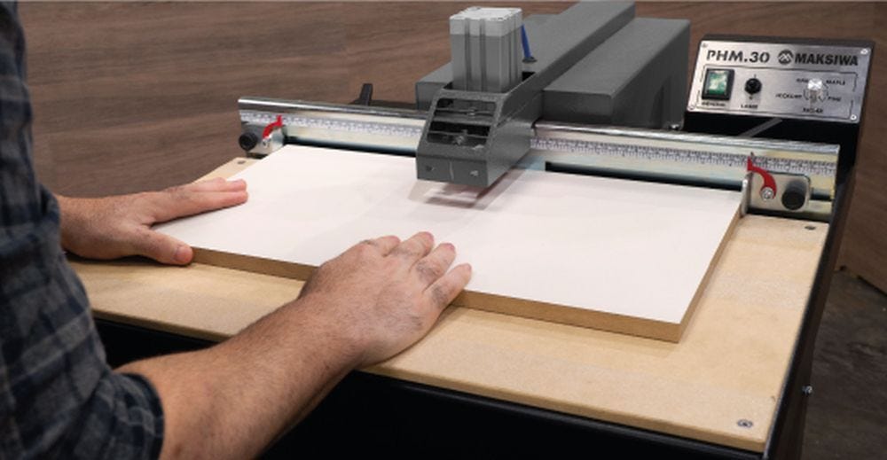 The PHM.30 Pocket Hole Machine by Maksiwa is engineered for professionals seeking efficiency and precision in production work. With a simple tap of the foot pedal, this durable machine clamps the stock, routes a pocket, and drills a pilot hole seamlessly.The Maksiwa Pocket Hole is here. Clamp the stock, route the pocket, and drill a pilot—all with a simple press of the pedal. Get more work done with the speed you need and deliver a pocket assembly with the precision you want for the professional "job well done" you can be proud of.Whether you are in a medium or small-sized shop, the Maksiwa Pocket Hole Machine delivers quality and performance, improving the lives of woodworkers like you!Maksiwa's Pocket Hole Machine is made for production work. It'll boost the volume of your production output and the quality of the end results without taking up that much-needed space in your shop. It's designed with small to medium professional shops in mind.Don't get bogged down with finicky tools that leave your projects poorly assembled and lacking that professional finish. Maksiwa's Pocket Hole Machine makes getting it right a breeze.As you tap on the foot pedal, a heavy pneumatic clamp holds down your stock. The machine then carves a four-degree angled pocket while simultaneously drilling the pilot hole. Within seconds from pressing the foot pedal, the cycle is complete, leaving you with the precise pocket that isn't frayed.Compared to competitors that use 6 or 15 degree angles, the four-degree angle in the Maksiwa Pocket Hole Machine minimizes movement when assembling your piece. The final result is clean and professional. It's a pocket hole you can be proud of without all the hassle.Don't break a sweat making pocket holes. The depth scale in the Maksiwa Pocket Hole Machine allows you to choose how far from the edge your machine will drill. The adjustable stops secure your piece right where you need it to be.Once you have your measurements in place, just tap the foot pedal and your perfect pocket and pilot holes are ready in mere seconds. It's easy, simple, and effective.Find all the controls you need in one place. On the control panel, switch on your machine. Flip on the toggle switch and a laser will let you know exactly where the pocket will be made.The adjustable speed control allows you to slow down the cycle when working with hardwoods or speed it up when working with softer woods.Maksiwa's Pocket Hole Machine also lets you choose between a smooth and textured surface for extra grip. Simply unscrew and flip the board.Finally, a 4-inch dust collector port on the back keeps your shop clean.To access the internals of the machine, simply pop the lid and the drills are just a hand’s reach away.The Pocket Hole Machine comes with two pre-installed Bosch routers: a 2 HP pocket router and a 1 HP pilot router. The bits are easily interchangeable. The machine includes a 2-flute carbide tipped pocket bit and a 1/8 pilot bit.Controlling the cycle of the routers, you'll find a Bosch electric motor to ensure a consistently smooth motion when creating that four-degree pocket angle.Drive your business forward, completing more jobs in a shorter amount of time without sacrificing quality.Experience for yourself how Maksiwa's Pocket Hole Machine has been helping woodworkers across the United States, delivering that "job well done" with professional results—in a fraction of the time.If you like what you saw and want to get a quote on one of those machines, leave your email in the comments below or go to maksiwa.com/usa and get a free quote. One of our sales representatives will contact you.Maksiwa, helping woodworkers realize their dreams.