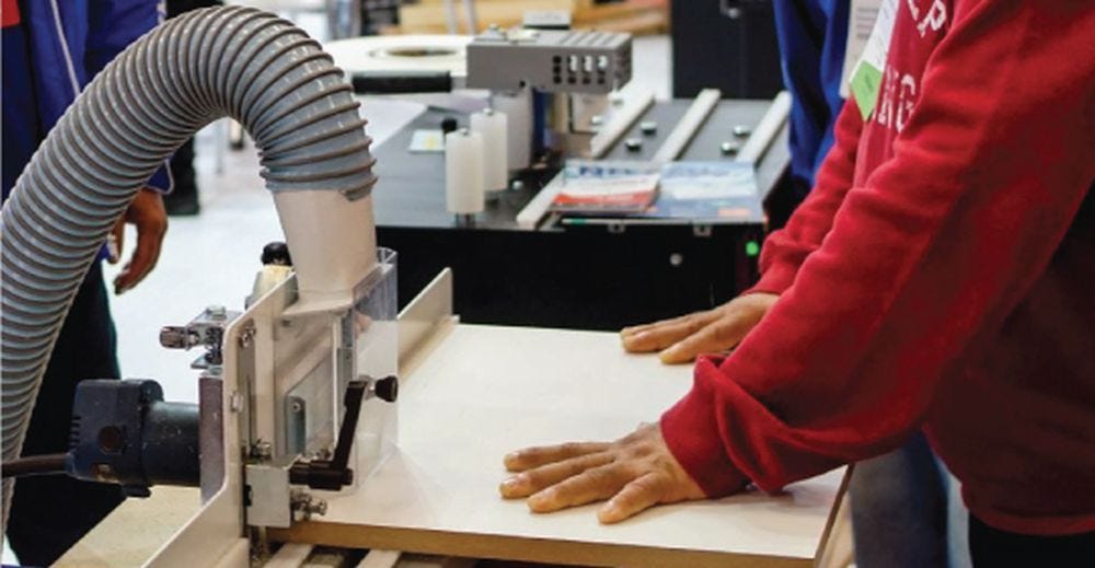 The RBB.1000 Edge Banding Trimmer by Maksiwa is your go-to solution for quick and precise trimming and scraping of edge tape on various workpieces. Designed for versatility, it features an adjustable mounting system that allows easy installation on any type of workbench.