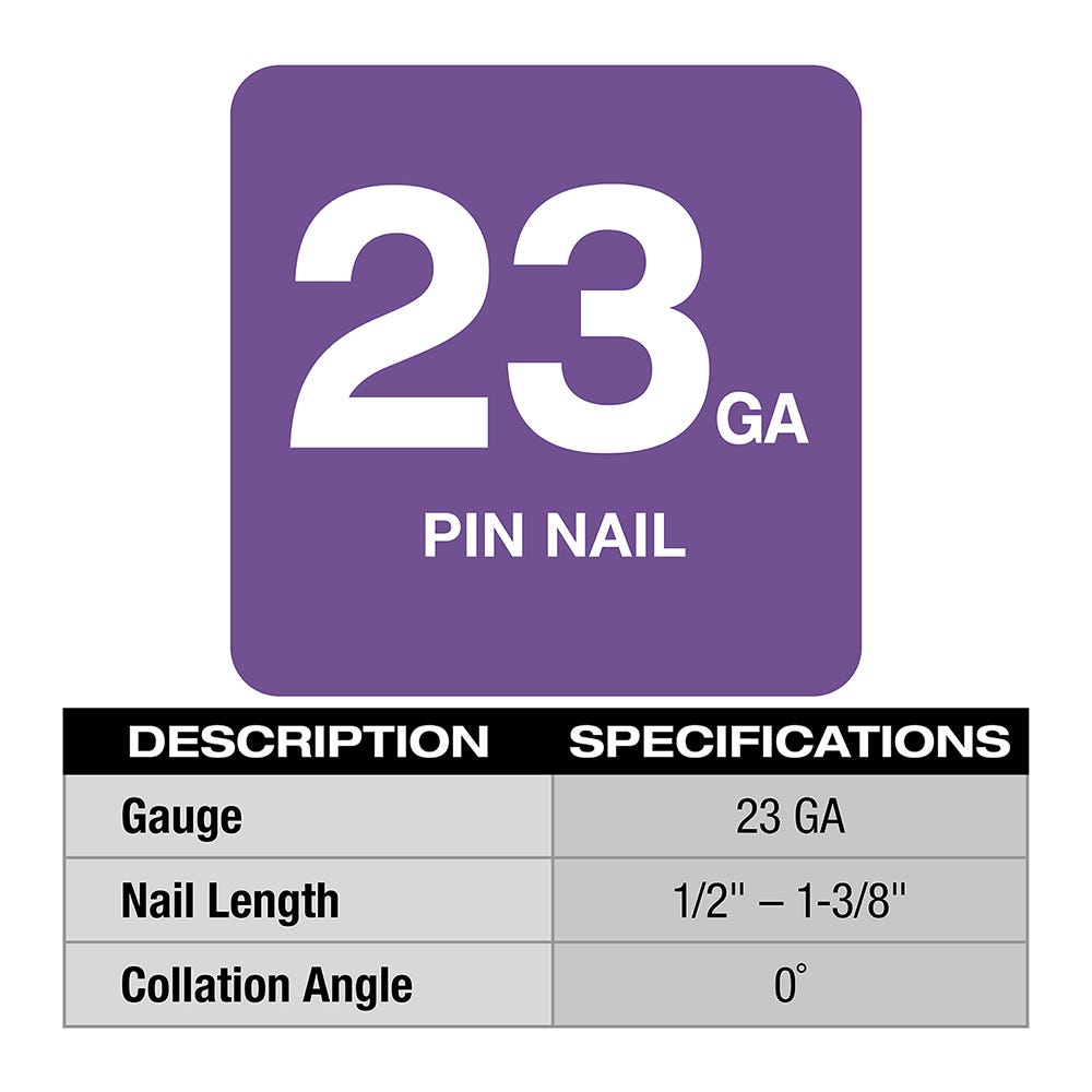 - Compatible with 1/2" to 1-3/8" 23 Gauge Headless Pin Nails