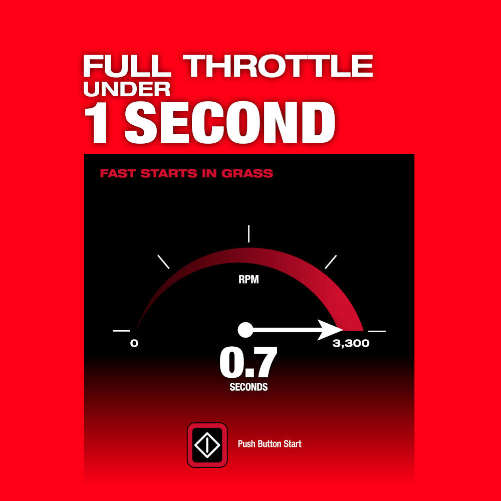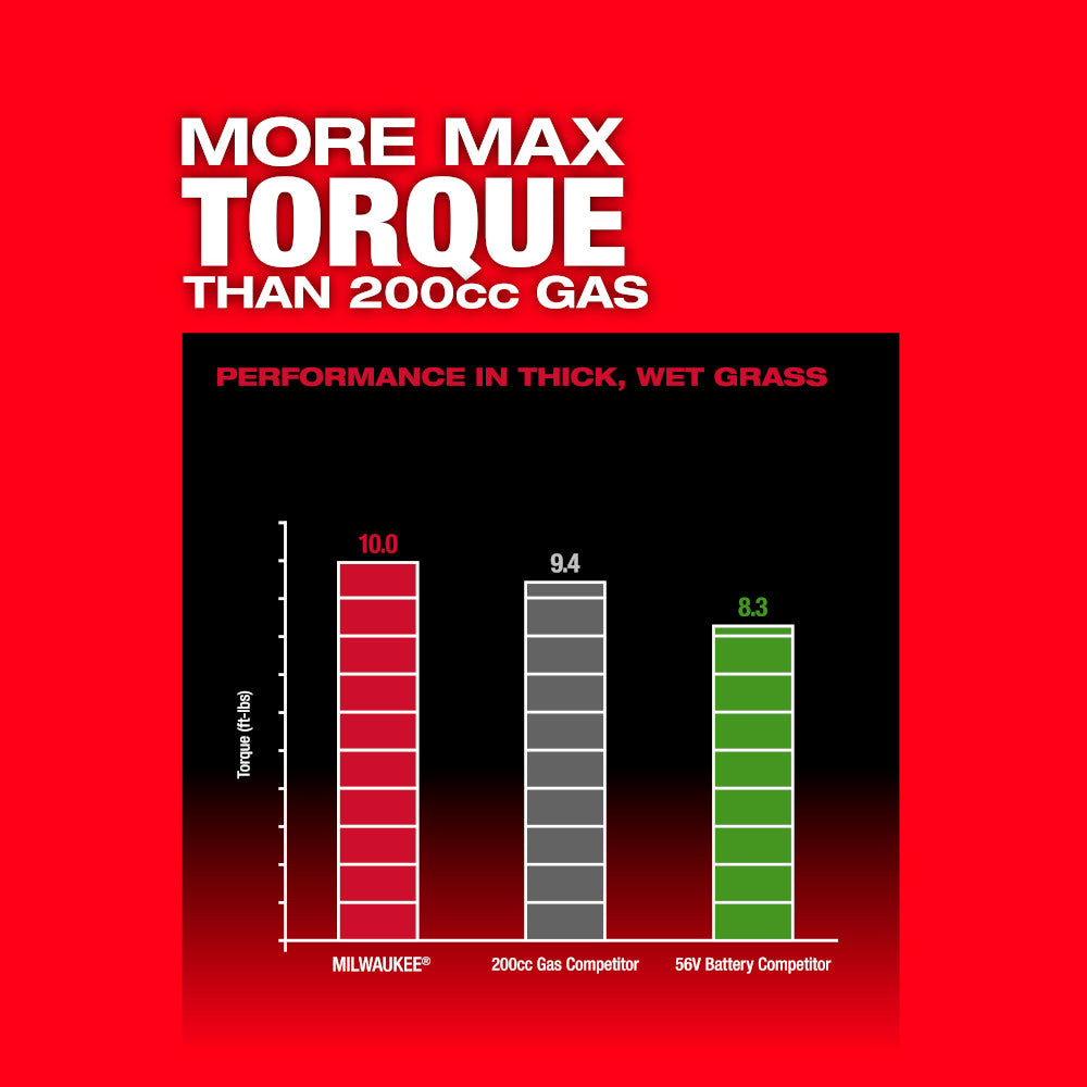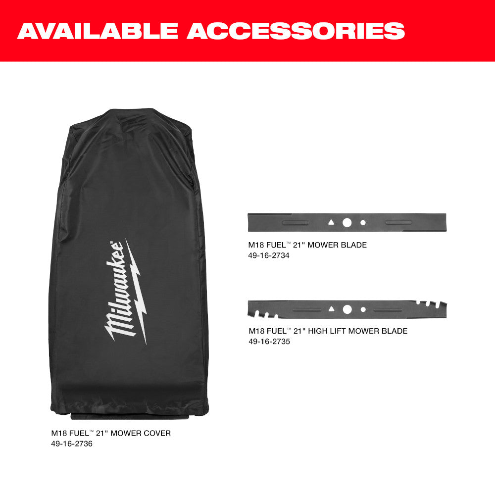 The MILWAUKEE M18 FUEL 21" Self-Propelled Dual Battery Mower Kit meets the performance, durability, and ergonomic needs of landscape maintenance professionals. The optimized steel deck design paired with higher blade speed allows the battery-powered lawn mower to achieve superior airflow and increased lift to deliver the best cut quality in mulching, bagging, and side discharge applications. The POWERSTATE Brushless Motor delivers more max torque than 200cc gas to take on the most demanding mowing applications. Milwaukee REDLINK PLUS Intelligence offers total system communication between tool and battery for unmatched levels of performance, protection, and productivity. The advanced electronic package also delivers an instant throttle response on both the lawn mower blade and drive motors to reach full throttle in under 1 second, which increases control and productivity. The mower requires 2 M18 REDLITHIUM Batteries for operation. When paired with the included 2 M18 REDLITHIUM HIGH OUTPUT HD12.0 batteries, the mower delivers up to 60 minutes of runtime, allowing up to 1/2 acre of cutting when removing 1" of grass at a 3 MPH self-propelled pace. The Variable Speed Self-Propelled Mower offers speeds between 0 - 4 MPH, and the Active Speed Management Paddles allow users to easily adjust their walking pace while in operation to increase control. This battery-operated self-propelled lawn mower features a steel deck, 3-in-1 grass management, single point height adjustment, high lift mode, front & side LED lights, vertical storage, and two deck handles. The M18 FUEL 21" Self-Propelled Dual Battery Mower is part of the M18 System, fully compatible with over 200 solutions.