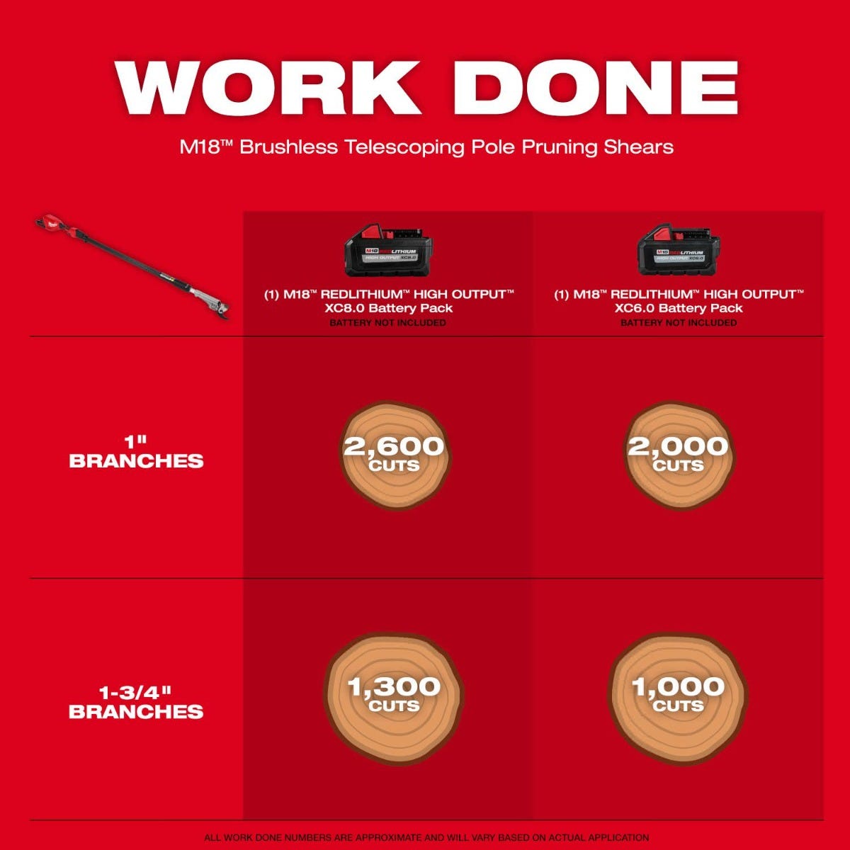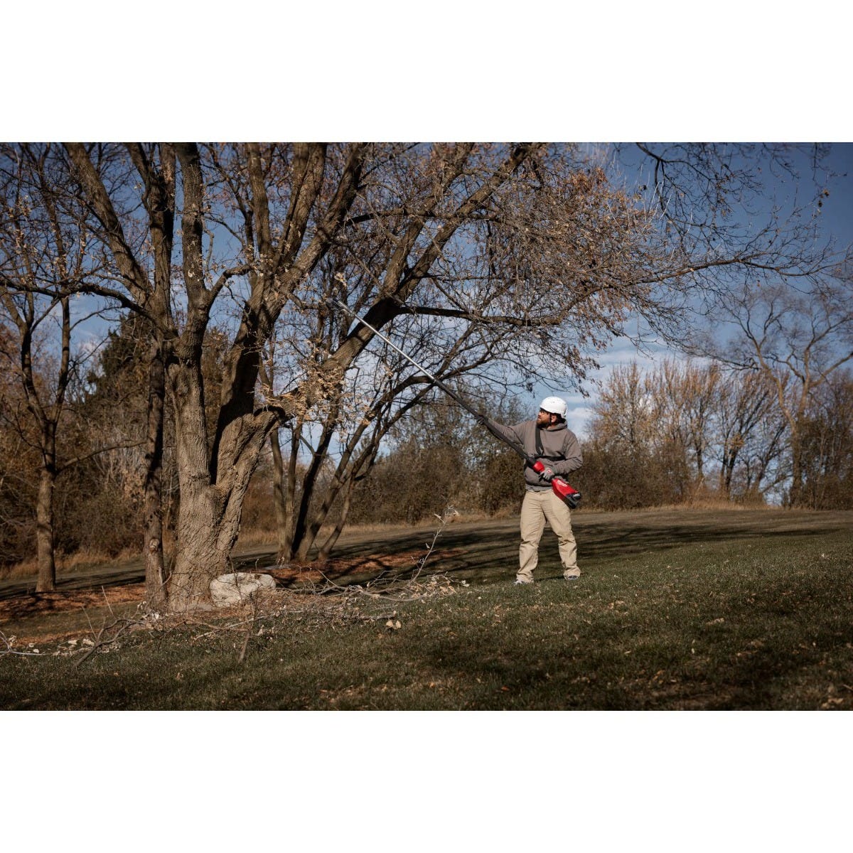 The MILWAUKEE M18 Brushless Telescoping Pole Pruning Shears provide fast, clean pruning, and eliminate the repetitive pulling associated with manual units. The telescoping pole pruning shear's Brushless motor gives the ability to make clean and precise bypass pruning cuts in branches of up to 1-3/4" diameter with minimal effort. The telescoping pole pruning shears feature an ergonomic adjustment collar that allows users to telescope quickly from 7ft to 10ft in length. The M18 Brushless Telescoping Pole Pruning Shear reduces peak muscle activation up to 80% and completes challenging applications up to 3X faster than manual solutions. When paired with the M18 REDLITHIUM HIGH OUTPUT XC6.0 Battery Pack (not included), the telescoping pole pruning shears can complete up to 2, 000 cuts per charge in 1" branches. The Milwaukee M18 Brushless Telescoping Pole Pruning Shears are fully compatible with 250+ solutions in the M18 system.