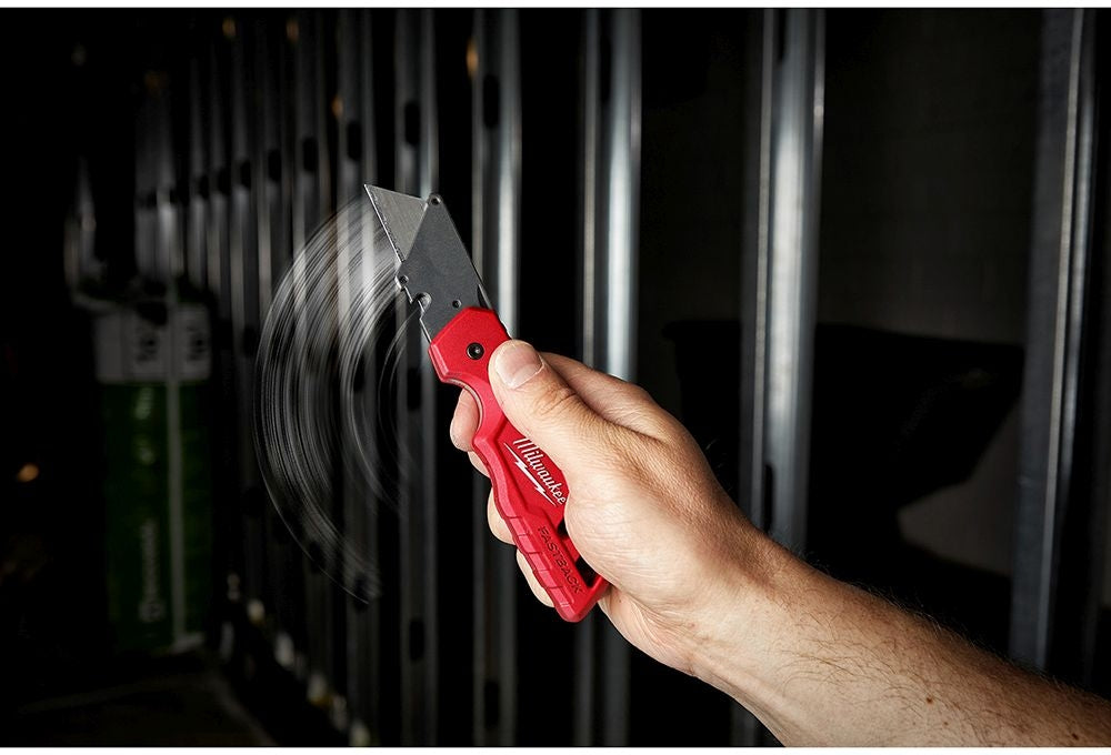 Our FASTBACK Folding Utility Knife features a press and flip mechanism for easy, one-handed opening. The MILWAUKEE FASTBACK Folding Utility Knife allows you to make quick, tool-free blade changes for maximum jobsite efficiency. The utility knife has an all metal body, an integrated gut hook and wire stripper for increased versatility. The folding utility knife is equipped with a durable wire belt clip to reduce pocket tearing and a blade holder designed for scoring. The folding utility knife has a metal extension that prevents accidental blade removal and a lanyard hole for convenient tethering.