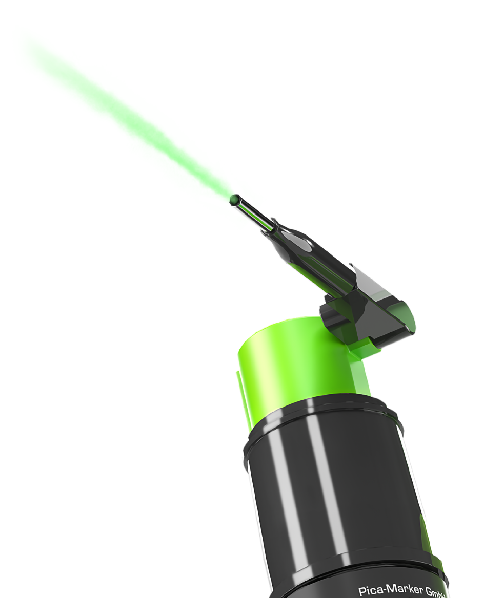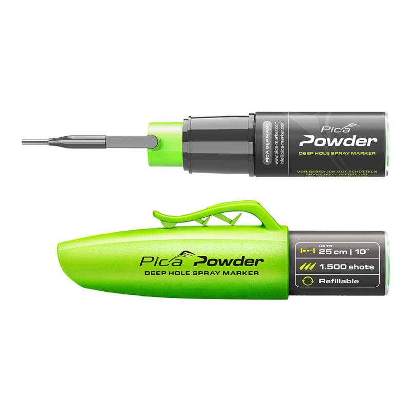 The Pica Powder enables precise and fast markings through drill holes up to 250 mm deep. It leaves green fluorescent chalk-based markings with a spray burst.