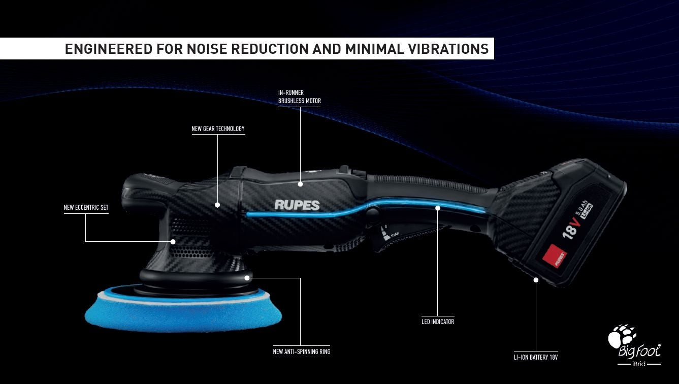 Introducing the iBrid Rupes BigFoot polishers, a true game-changer in the world of polishing applications. This compact yet powerful tool seamlessly combines cordless and corded capabilities, offering freedom and reliability. Whether you’re a professional or an enthusiast, this polisher elevates your work to a new level. Experience unparalleled performance, ergonomic design, and adaptability like never before. Welcome to the future of surface care with the iBrid Rupes BigFoot polishers: New eccentric set, New anti-spinning ring, In-runner brushless motor, New gear technology, Led indicator, and Li-ion battery 18V.