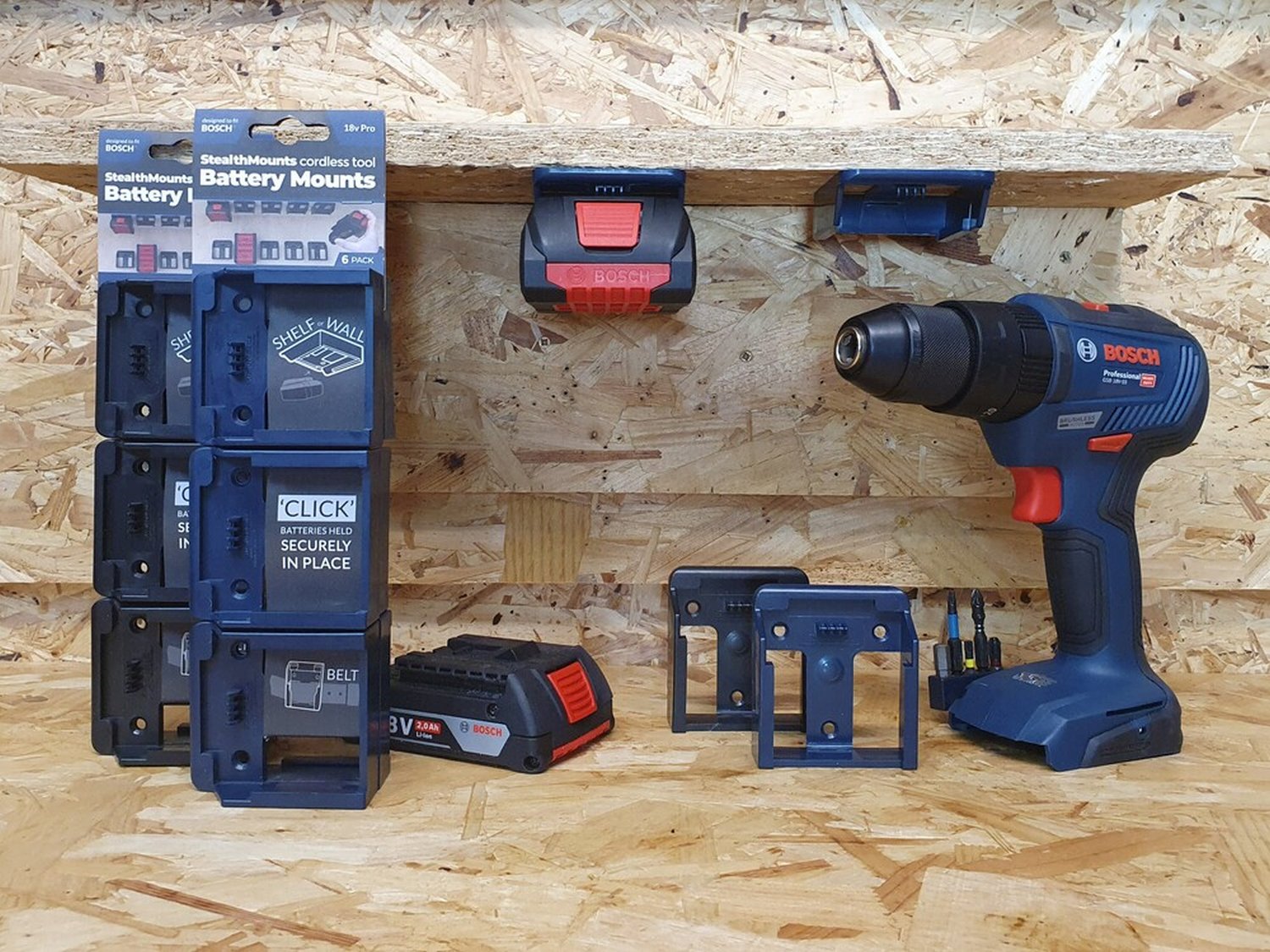 StealthMounts Battery Mounts for Bosch ProCORE & Professional cordless batteries keep your batteries organized and exactly where you need them. Batteries fit by clicking into the holder and are only released by pressing the release button on the battery. Batteries can be held at any angle locked in the holder and will not fall out even whilst travelling. Perfect for mobile setups or workshops! Manufactured in the United Kingdom our Bosch ProCORE & Professional Battery Mounts are made using extremely durable injection moulded ABS plastic with countersunk screw holes to allow for firm mounting on multiple surfaces. Great for keeping track of your batteries and staying organized. They can be mounted at any distance from one another and in tight spaces for maximum workshop efficiency. Mount them in your workshop, under shelves, toolboxes, tool trailers or in your work vehicles with due care. They can also be looped through a belt for use on the job site.