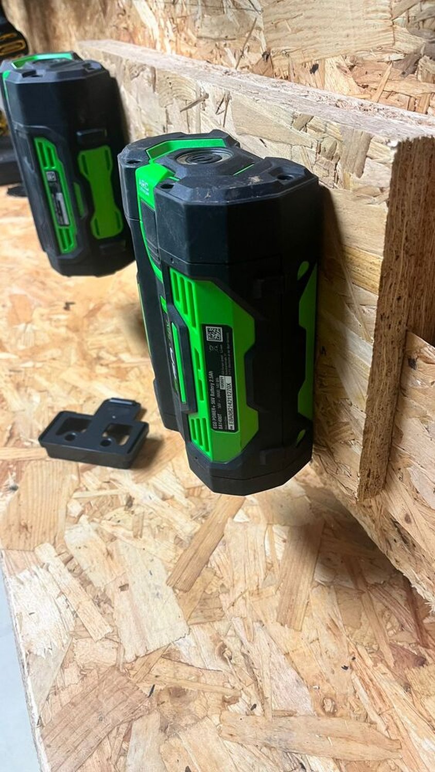 StealthMounts Battery Mounts for EGO cordless batteries keep your batteries organized and exactly where you need them. Batteries fit by clicking into the holder and are only released by pressing the release button on the battery. Batteries can be held at any angle locked in the holder and will not fall out even whilst travelling. Perfect for mobile setups or workshops! Manufactured in the United Kingdom our EGO Battery Mounts are made using extremely durable injection moulded ABS plastic with countersunk screw holes to allow for firm mounting on multiple surfaces. Great for keeping track of your batteries and staying organized. They can be mounted at any distance from one another and in tight spaces for maximum workshop efficiency. Mount them in your workshop, under shelves, toolboxes, tool trailers or in your work vehicles with due care. They can also be looped through a belt for use on the job site. StealthMounts Battery Mounts are available color coded to match your EGO platform