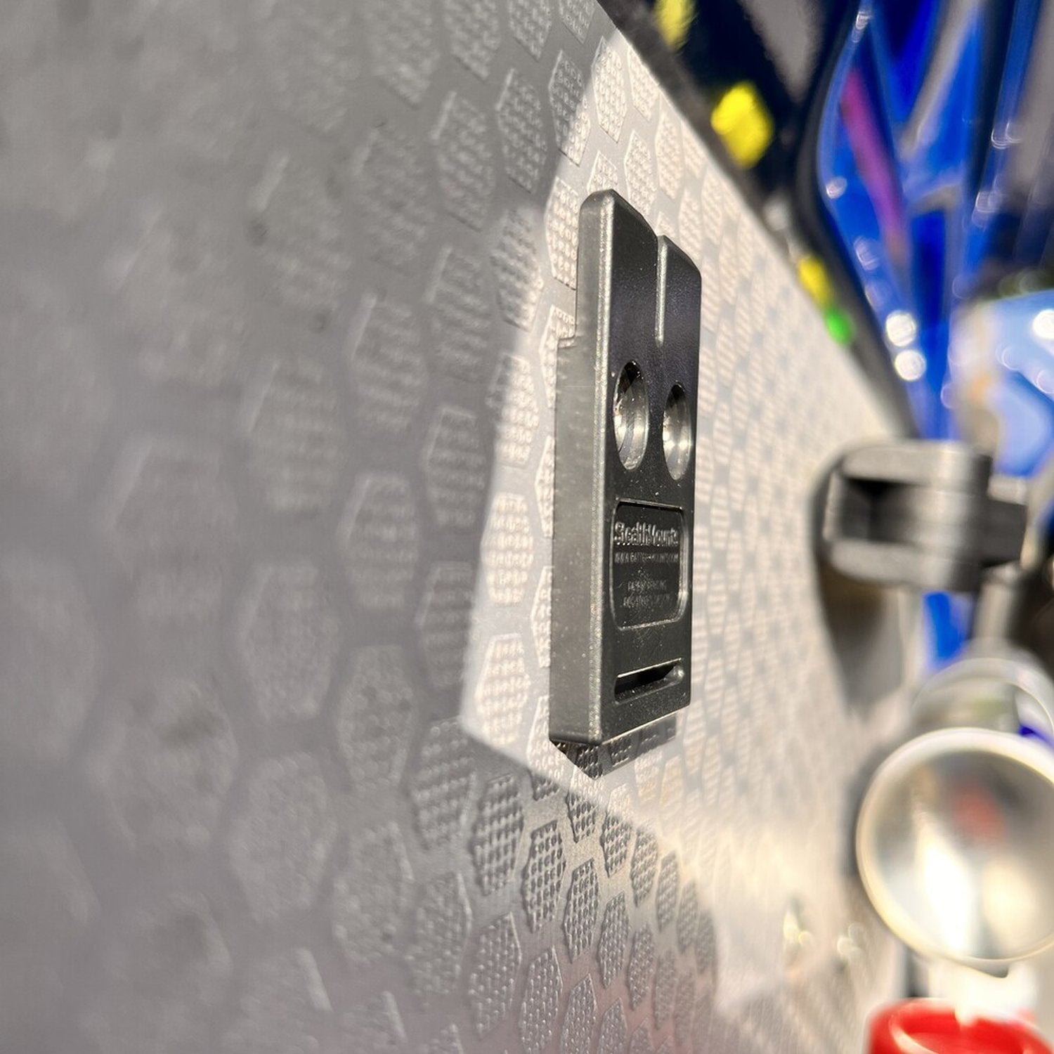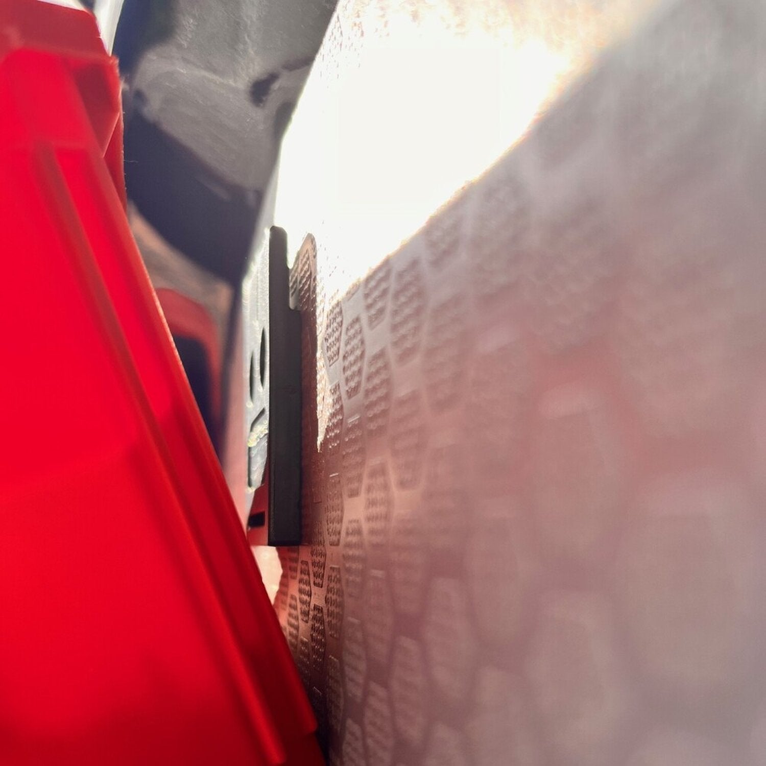 StealthMounts Black Bin Buddy for Packout Bins, Ridgid AEG Bins & Keter Bins. This will allow you to mount your Bins included with Milwaukee Packout toolboxes, Ridgid toolboxes and Keter organizers to any flat surface keeping your accessories organized. Simply screw the Bin Mount to a wall in your workshop or your tool trailers allowing easy mounting and organisation of all your extra red bins. Perfect for mobile setups or workshops. StealthMounts Bin Buddy will allow a flush mounting to your workshop wall ensuring that your bins are level, and your contents does not spill. Easily hang, remove, and reorganize your bins for use across your workspace. They can be mounted at any distance from one another and in tight spaces for maximum workshop efficiency. Mount them in your workshop, under shelves, tool trailers or in your work vehicles with due care. Manufactured in the United Kingdom our StealthMounts Bin Buddy are made using extremely durable injection moulded ABS plastic with countersunk screw holes to allow for firm mounting.