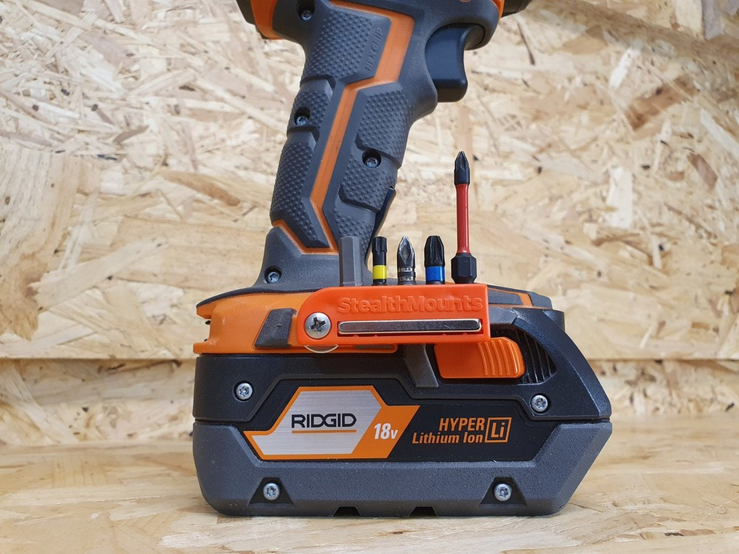 StealthMounts Bit Holders for AEG & Ridgid 18v are the perfect addition for your drill or impact driver. This bitholder keeps your bits together, organized and on your drill or impact driver. Our AEG & Ridgid 18v Bit Holders come in a pack of 2. Each magnetic bitholder can hold up to 5 bits allowing you to access your most common drill bits ensuring that you never lose track of them. The appropriate screw for mounting to most of your AEG & Ridgid 18v tools is provided. The magnet allows the bitholder to be mounted to the tool at different angles, extra screws can also be stored on the side of the magnet. Bits won't fall out even when the holder is mounted upside down. Made in Great Britain our AEG & Ridgid Bit Holders are made with extremely durable injection moulded ABS plastic.