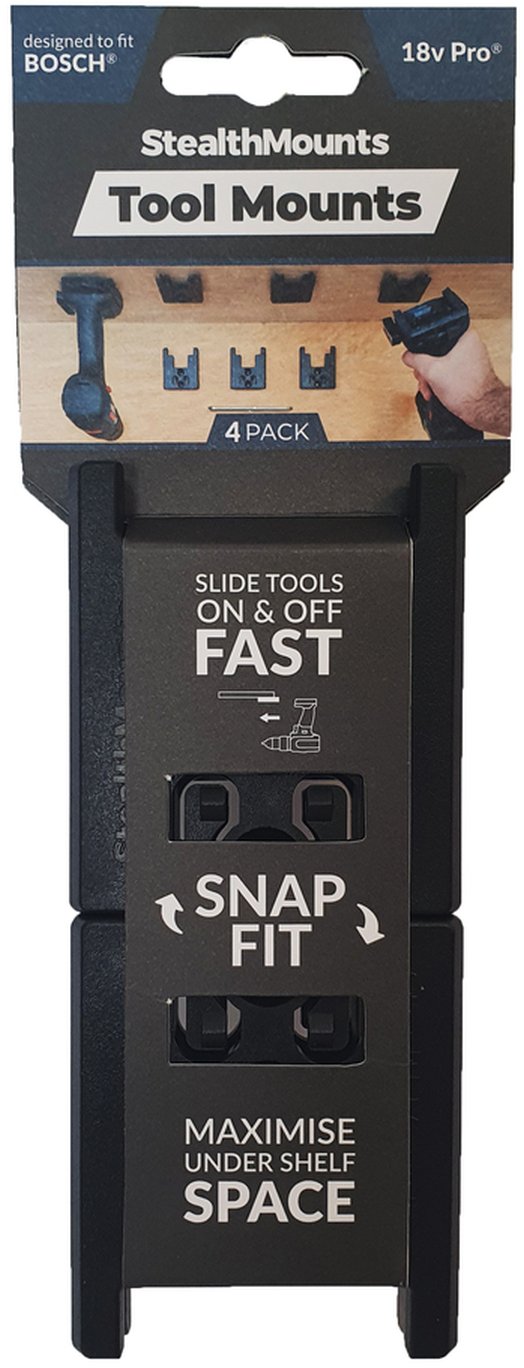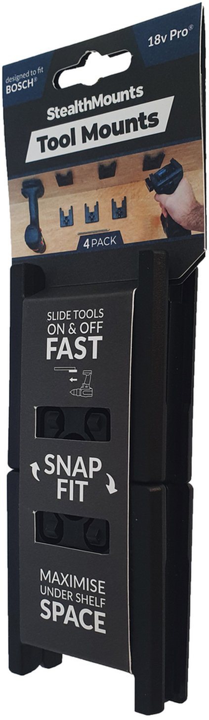 StealthMounts Tool Mounts for Bosch ProCORE & Professional cordless tools keep your tools organized and right where you need them. Tools are held securely using our Snap-Fit system, simply slide you tool onto the holder until you hear a click. Made in Great Britain our Bosch ProCORE & Professional Tool Mounts are made using extremely durable injection moulded ABS plastic with countersunk screw holes to allow for secure mounting. Ideal for keeping track of you tools and staying organized. They can be mounted at any distance from one another and in small spaces for maximum workshop efficiency. Rated for use in your workshop and under shelves. They can be used in tool trailers or in your work vehicles with due care. Easily release your tool by pulling it off the mount. Available to match your color coded Bosch ProCORE & Professional platform.
