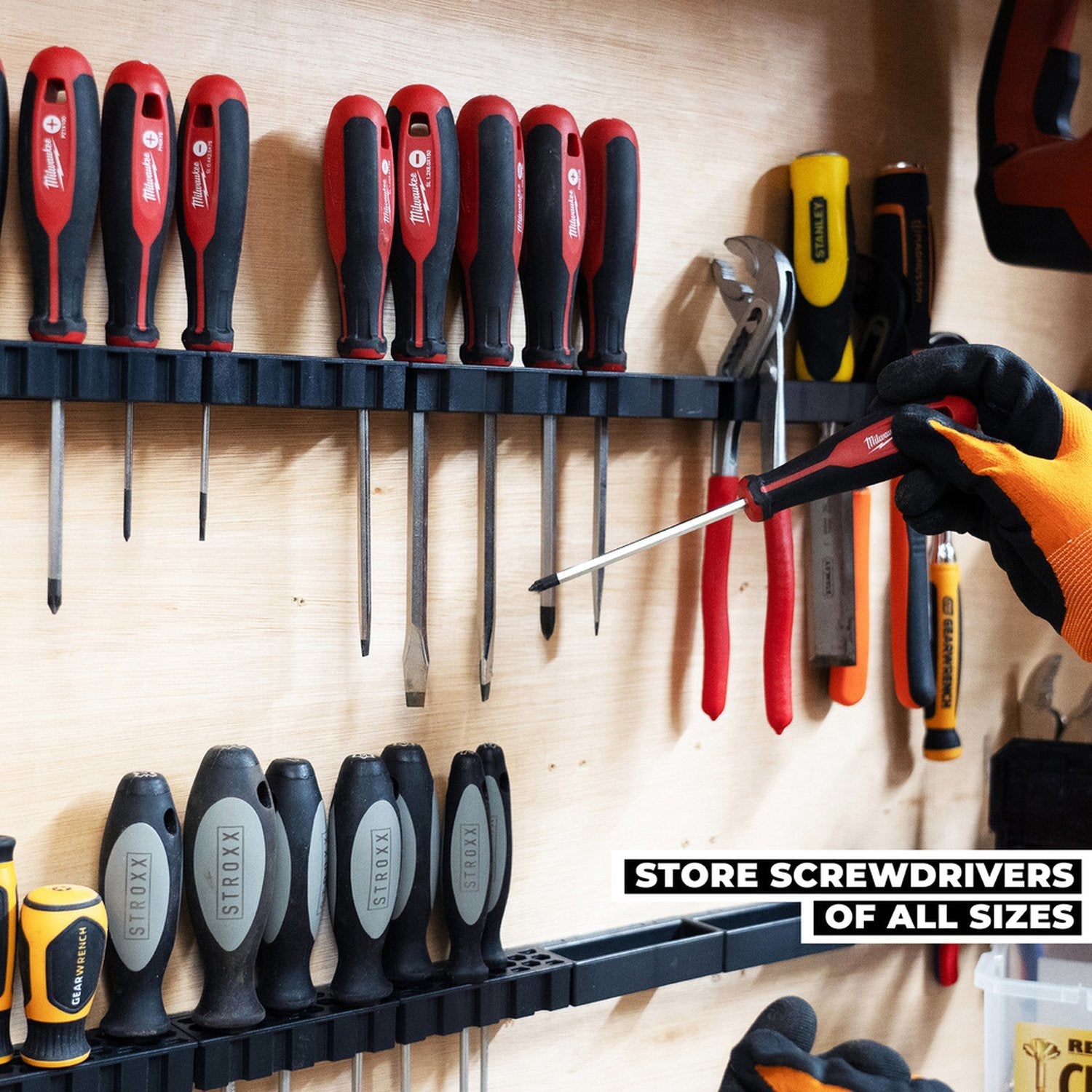 StealthMounts Wall Hive organizer for hand tools allows easily accessible storage for your important screwdrivers. Organize your most used hand tools with our efficiently designed wall-mounted Wall Hive system. Attach the Wall Hive to your wall using StealthMounts Mini Cleats (included). Mounting with StealthMounts Mini Cleats allows for a modular storage system where the Wall Hive components can be mounted at any desired distance from one another and in tight spaces for maximum workshops efficiency. StealthMounts Wall Hive are compatible with the Milwaukee Packout system as well as StealthMounts original cleats and the Cleat v2, making your mounting possibilities for StealthMounts Wall Hive endless. This system includes 4 different organisational components and 4 Mini Cleats for attachment. 2 x Screwdriver Rack 2x Screwdriver Rack XL StealthMounts Wall Hive system is compatible with StealthMounts Cleats V2, StealthMounts Mounting Cleats and the Milwaukee range. Manufactured in the United Kingdom our Wall Hive system is made using extremely durable injection moulded ABS plastic.