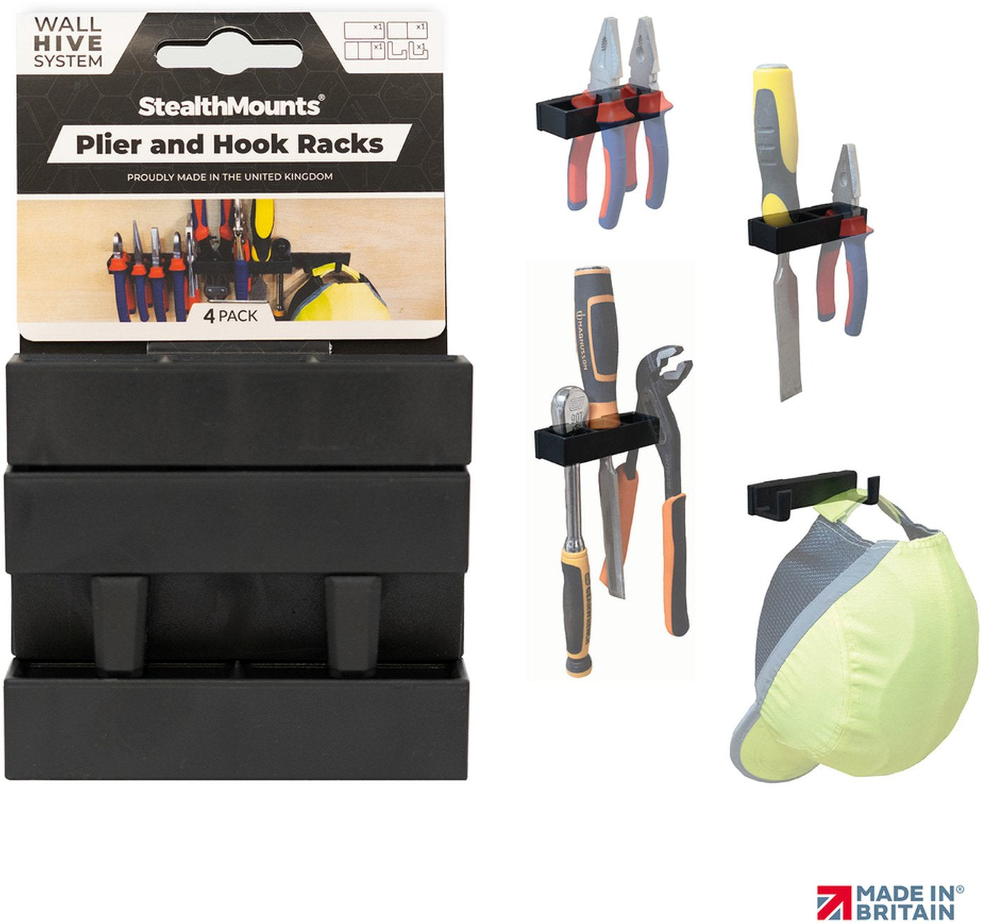 StealthMounts Wall Hive organizer for hand tools allows easily accessible storage for pliers, ear defenders, hi vis and more. Organize your most used hand tools with our efficiently designed wall-mounted Wall Hive system. Attach the Wall Hive to your wall using StealthMounts Mini Cleats (included). Mounting with StealthMounts Mini Cleats allows for a modular storage system where the Wall Hive components can be mounted at any desired distance from one another and in tight spaces for maximum workshops efficiency. StealthMounts Wall Hive are compatible with the Milwaukee Packout system as well as StealthMounts original cleats and the Cleat v2, making your mounting possibilities for StealthMounts Wall Hive endless. This system includes 4 different organisational components and 4 Mini Cleats for attachment. Hooks Open Holder Dual Holder Triple Holder StealthMounts Wall Hive system is compatible with StealthMounts Cleats V2, StealthMounts Mounting Cleats and the Milwaukee range. Manufactured in the United Kingdom our Wall Hive system is made using extremely durable injection moulded ABS plastic.