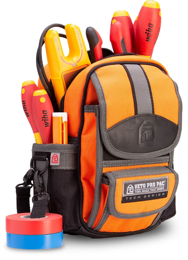 The MB HI-VIZ ORANGE is a compact meter/tool bag that features 10 pockets of various sizes that will accommodate a number of meters and some of the most commonly used tools to diagnose and repair problems on service calls. It also clips on to other Veto tool bags tape clip or D-Rings for convenient carrying. This bag has a rugged construction, interior cushioning, heavy duty YKK zippers, and a detachable rubber handle. An optional shoulder strap is sold separately. This bag has hi-visibility orange fabric with reflective accents.