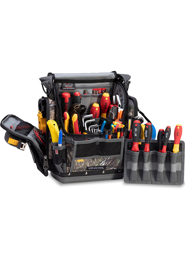 The TP-XXL CAMO DNA is a closable extra-large tool pouch designed with integral side mounted padded meter pockets. Each zippered meter pocket will securely fit meters up to 10 (260mm) x 3.5 (90mm) x 2 (50mm). Display the love of the outdoors with Mossy Oak (R) Country DNA fabric. The TP-XXL can be customized to hold a variety of tools, meters, fasteners, small tablet computer, and additional components.