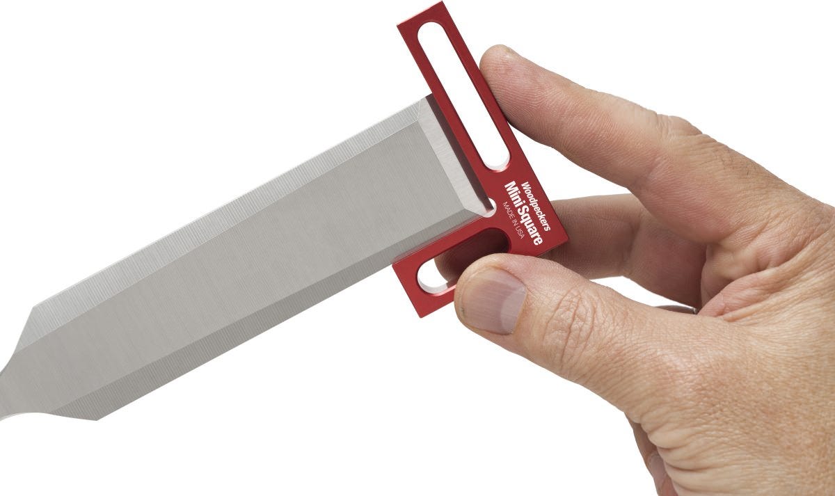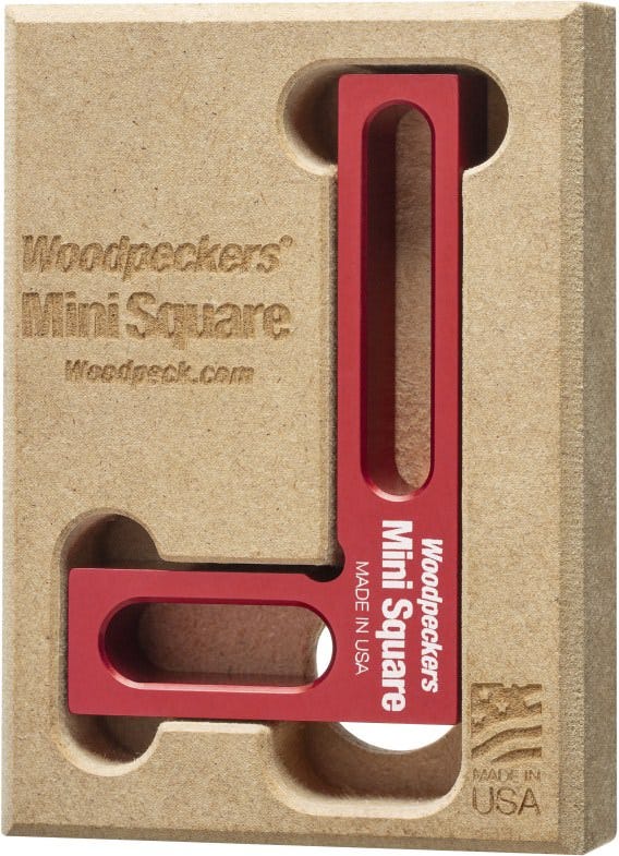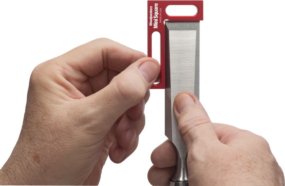 You can use any square for checking a chisel, but they're usually too long to clear the handle, not wide enough to make it easy to align to the edge and generally poorly designed for the job. That's why Woodpeckers came up with the Woodpecker Mini Square. At 1-1/8 x 2, inside dimension, it is absolutely perfect for checking the edge of your cutting tools for square. Light weight, easy to grip and machined from aluminum so it can't chip your tools. The dark red anodized finish makes it easy to detect any gaps. Fits in your pocket or its own custom fitted tray. Made in USA.