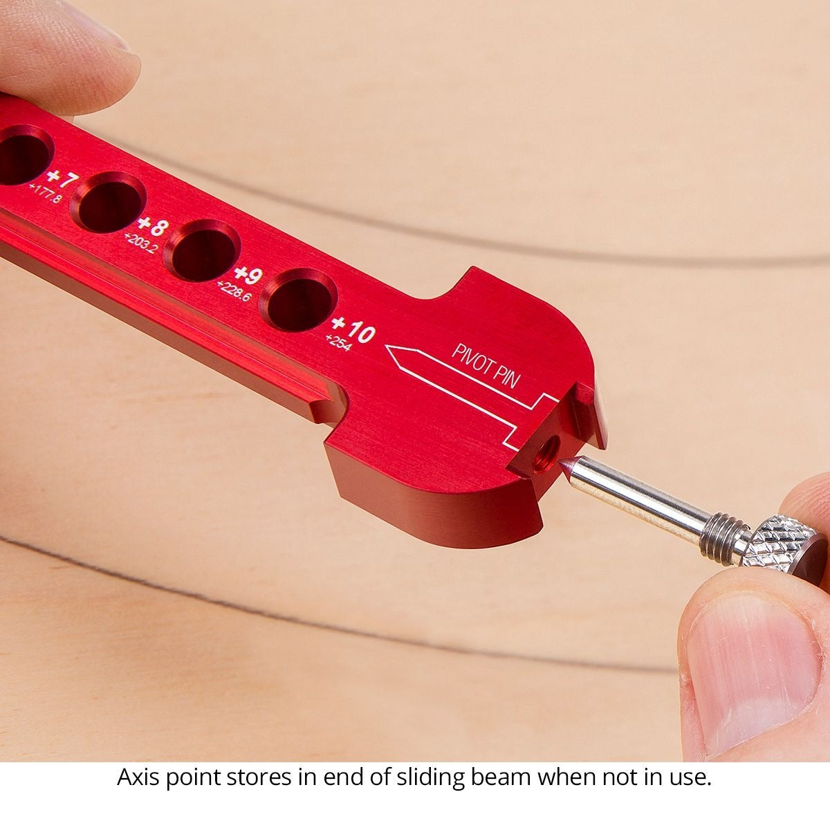 Woodpeckers Pocket Compass works similarly to a traditional beam compass, except, the beam of the Pocket Compass rests on the surface of your work. That means you’re not trying to balance the whole tool on two sharp points. Simply adjust the two-piece body to your desired measurement, remove the stainless-steel pivot pin from its storage port, spot it into your axis point, drop a pencil through the correct hole and draw your arc. Since the tool is lying flat on your work, you can get a new grip any time you need without losing your place. Gravity is working with you instead of against you.